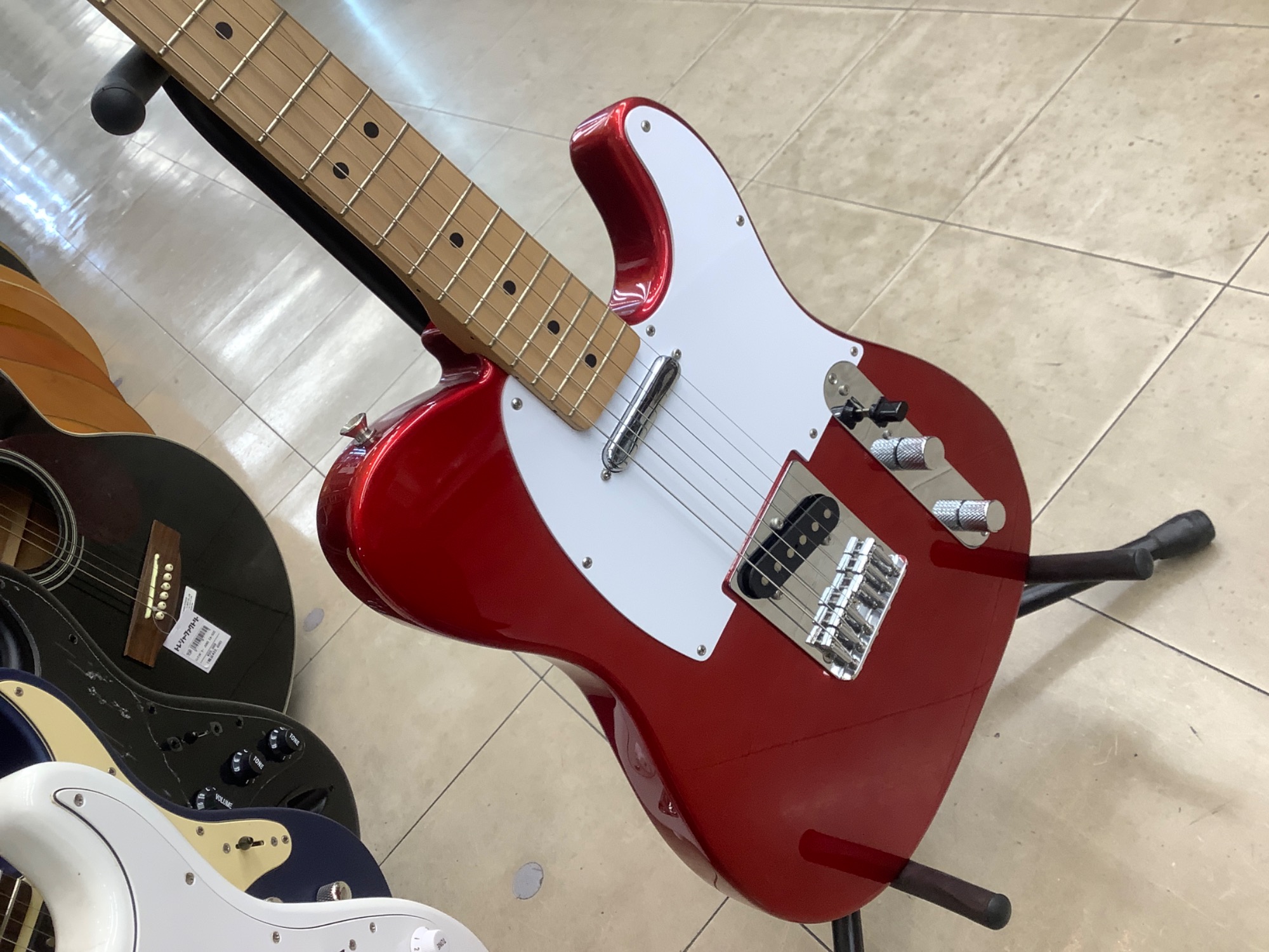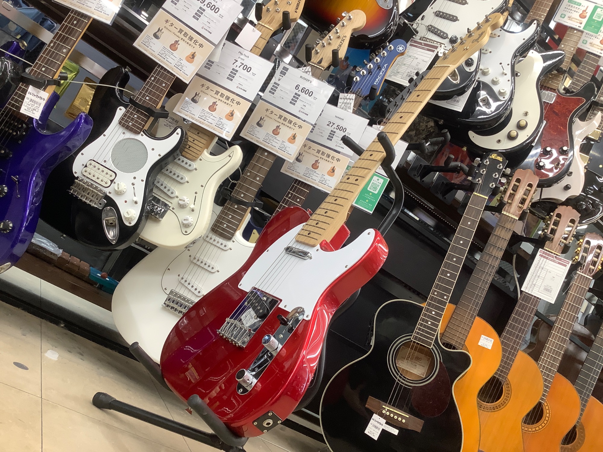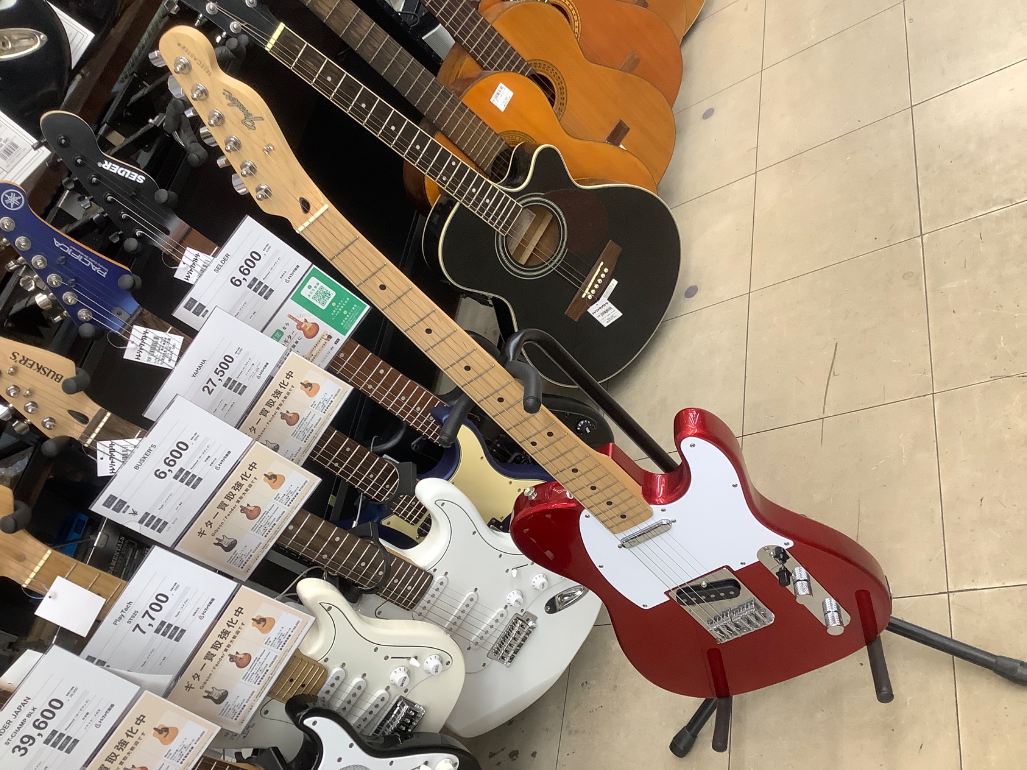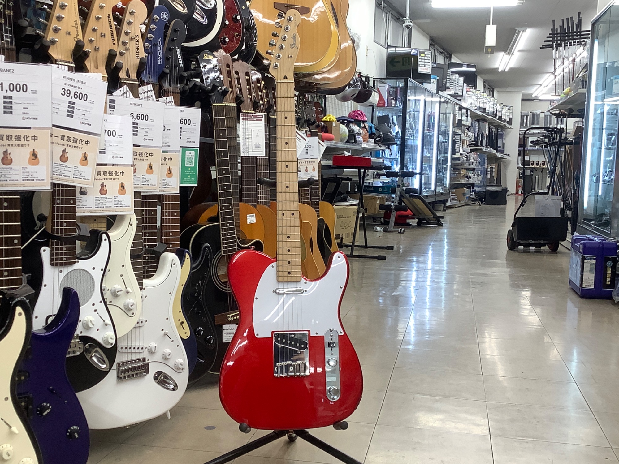 釣り具やアウトドア品を入口に展開しておりギターも常時20本以上展示しております。