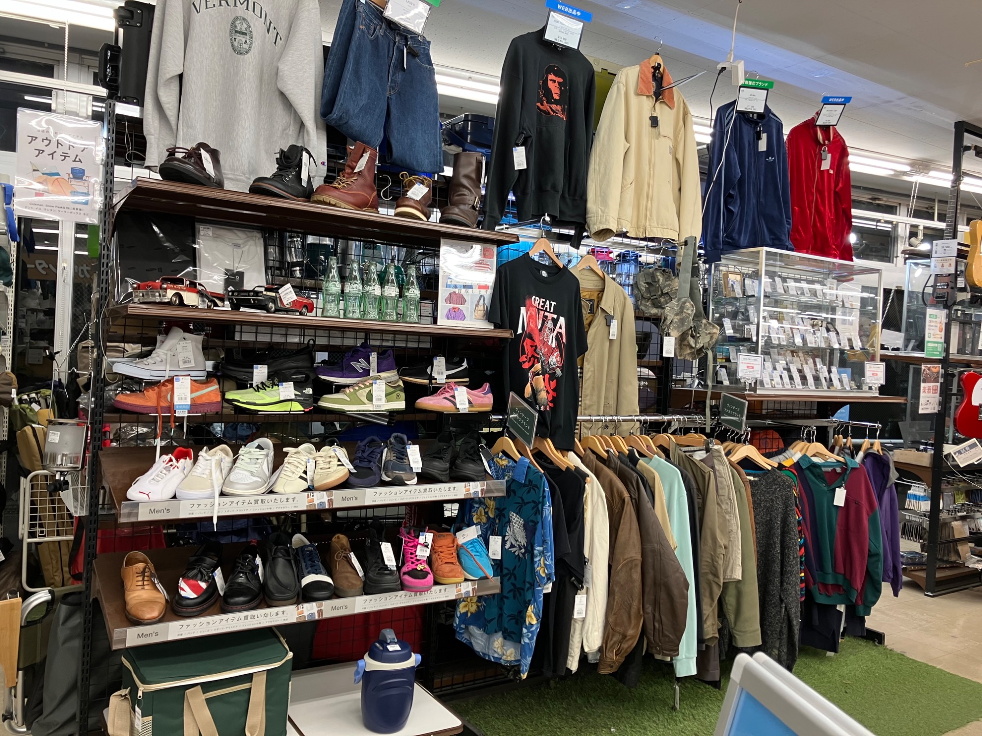 衣類やアウトドア品を入口に展開しておりギターも常時20本以上展示しております。