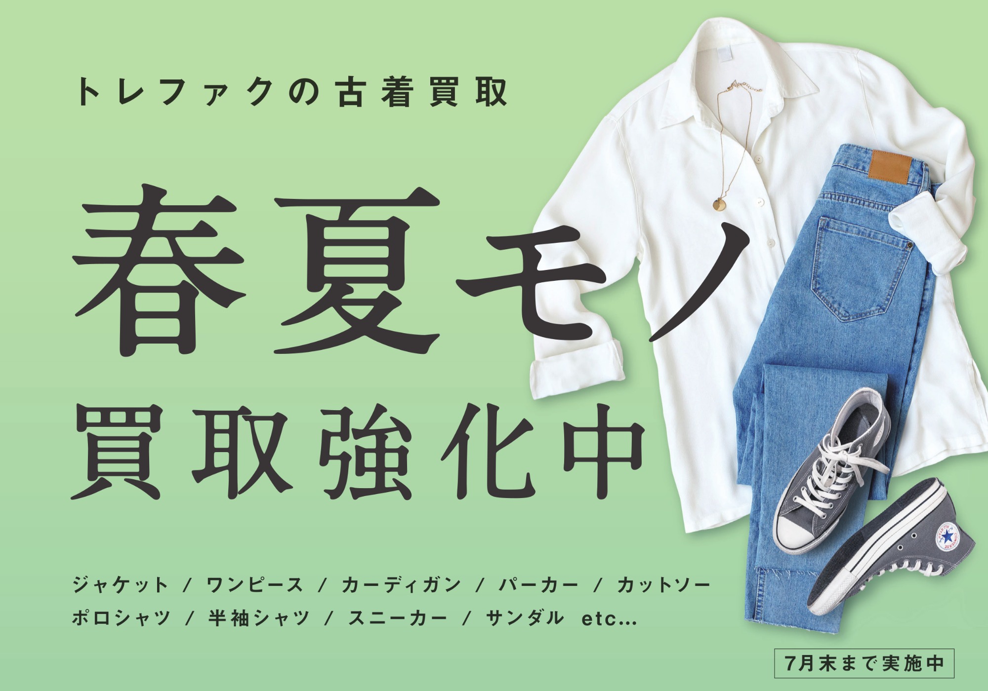 春夏に活躍する洋服、靴、バッグ等のアイテムを買取強化中です!