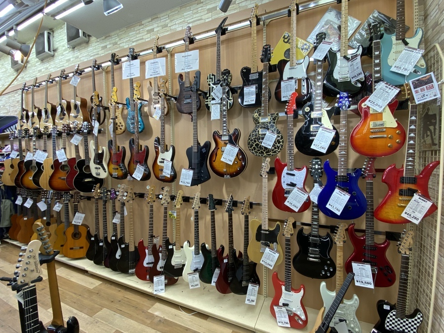 地域屈指の楽器強化店でギター、ベースなど常に60本以上展示しております。