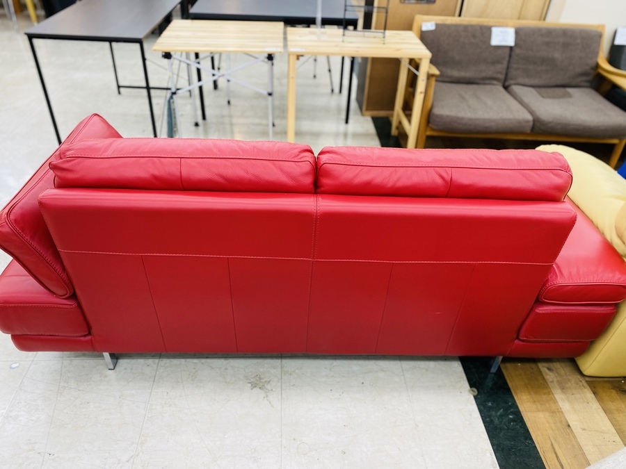 赤色が映えるこちらのソファー。存在感のあるお色ですが、フルレザーなので高級感があります。前面革張りで大変お買得な商品です!お部屋に色を添えるアイテムをお探しのお客様!ぜひご来店をお待ちしております。