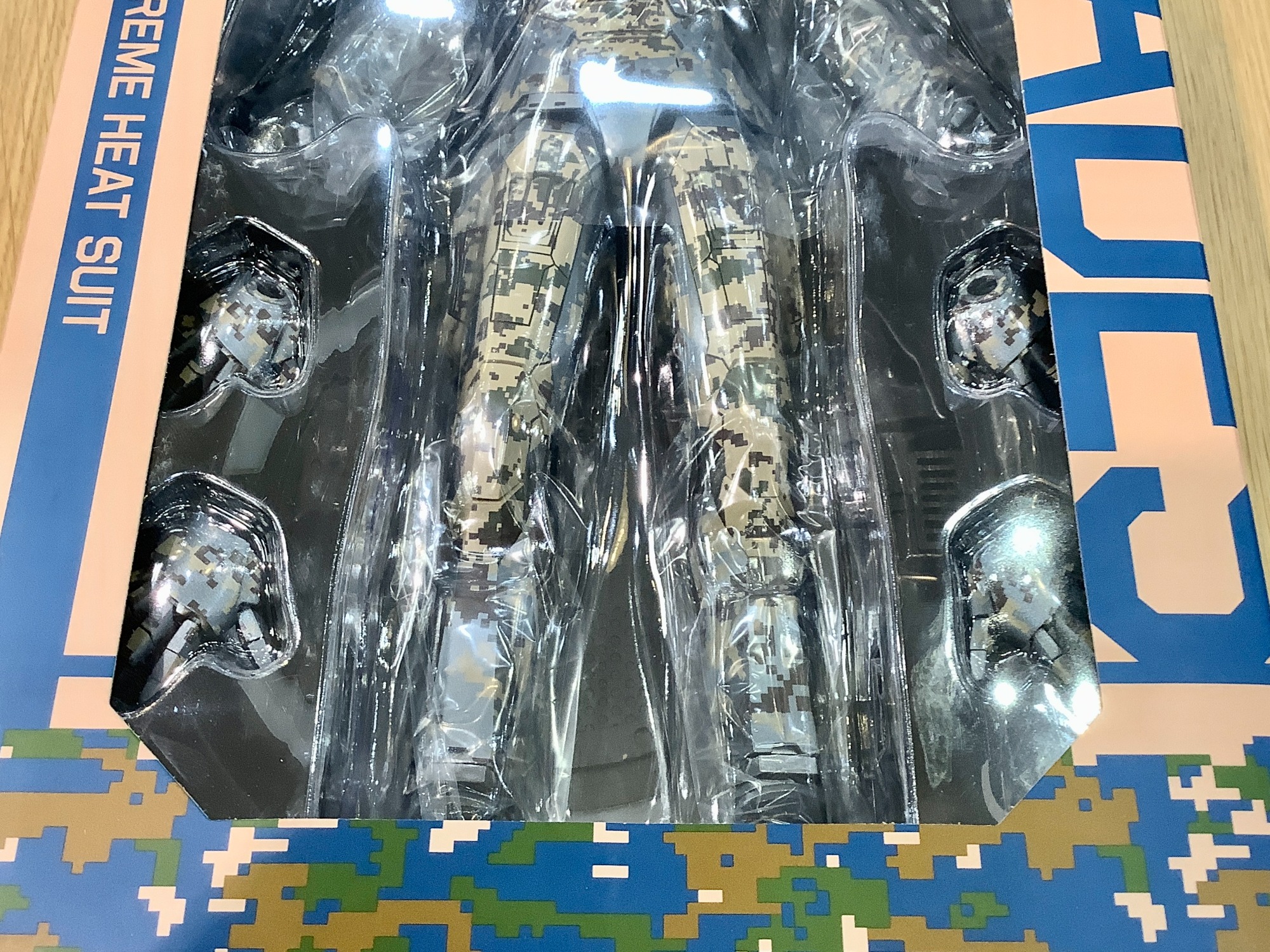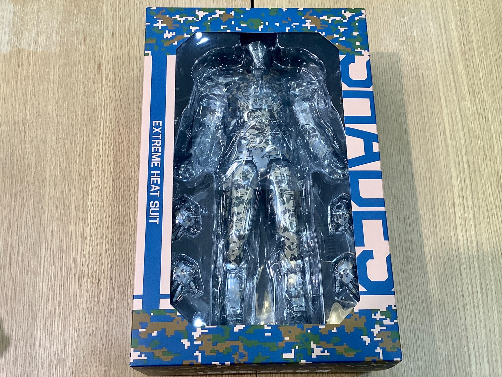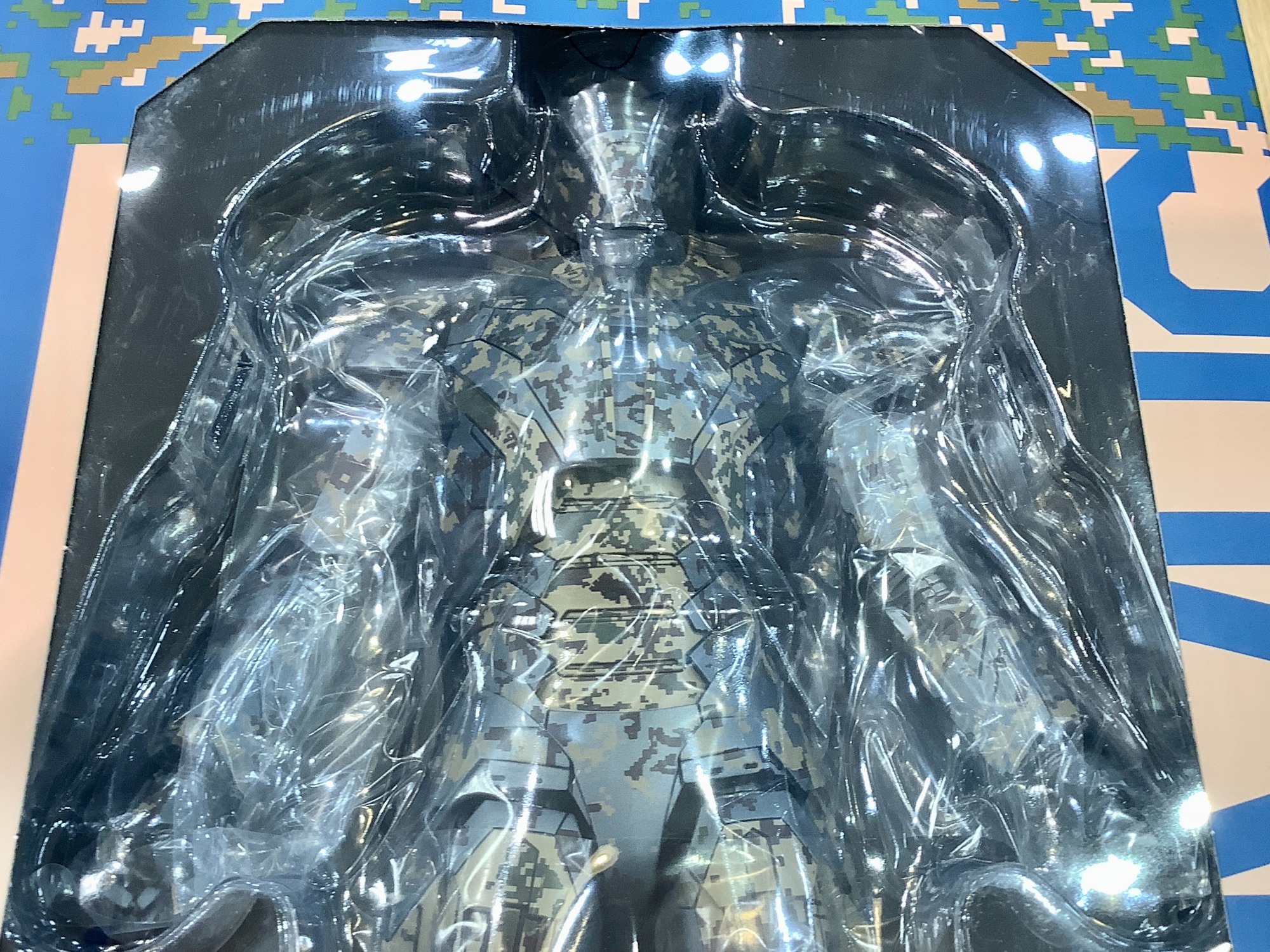 デジタル迷彩の模様が特徴的なアーマー、金属の質感を再現すべく高品質な塗装が施されております。