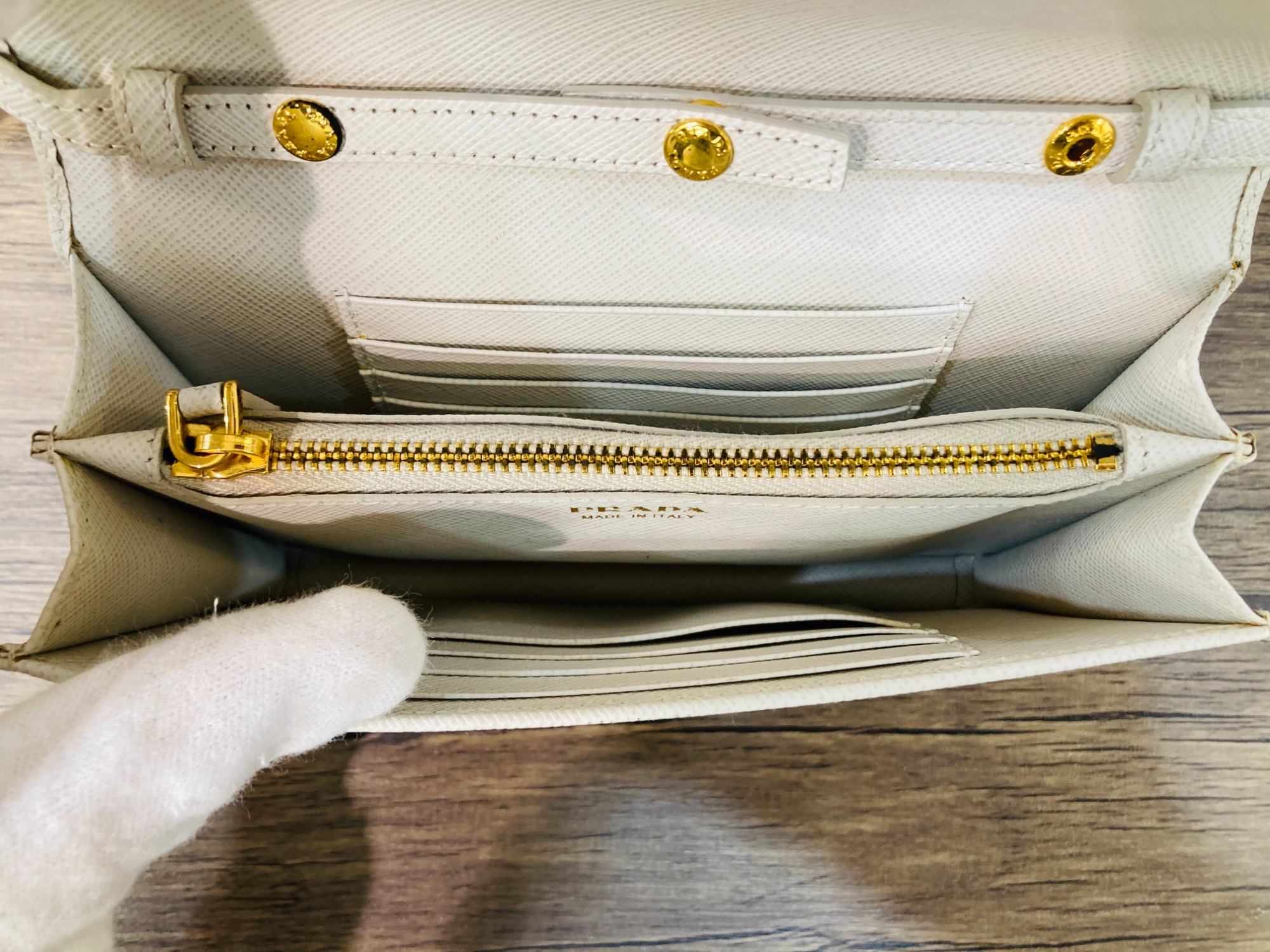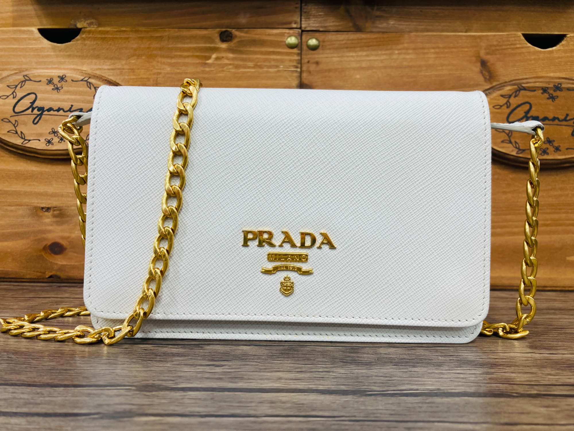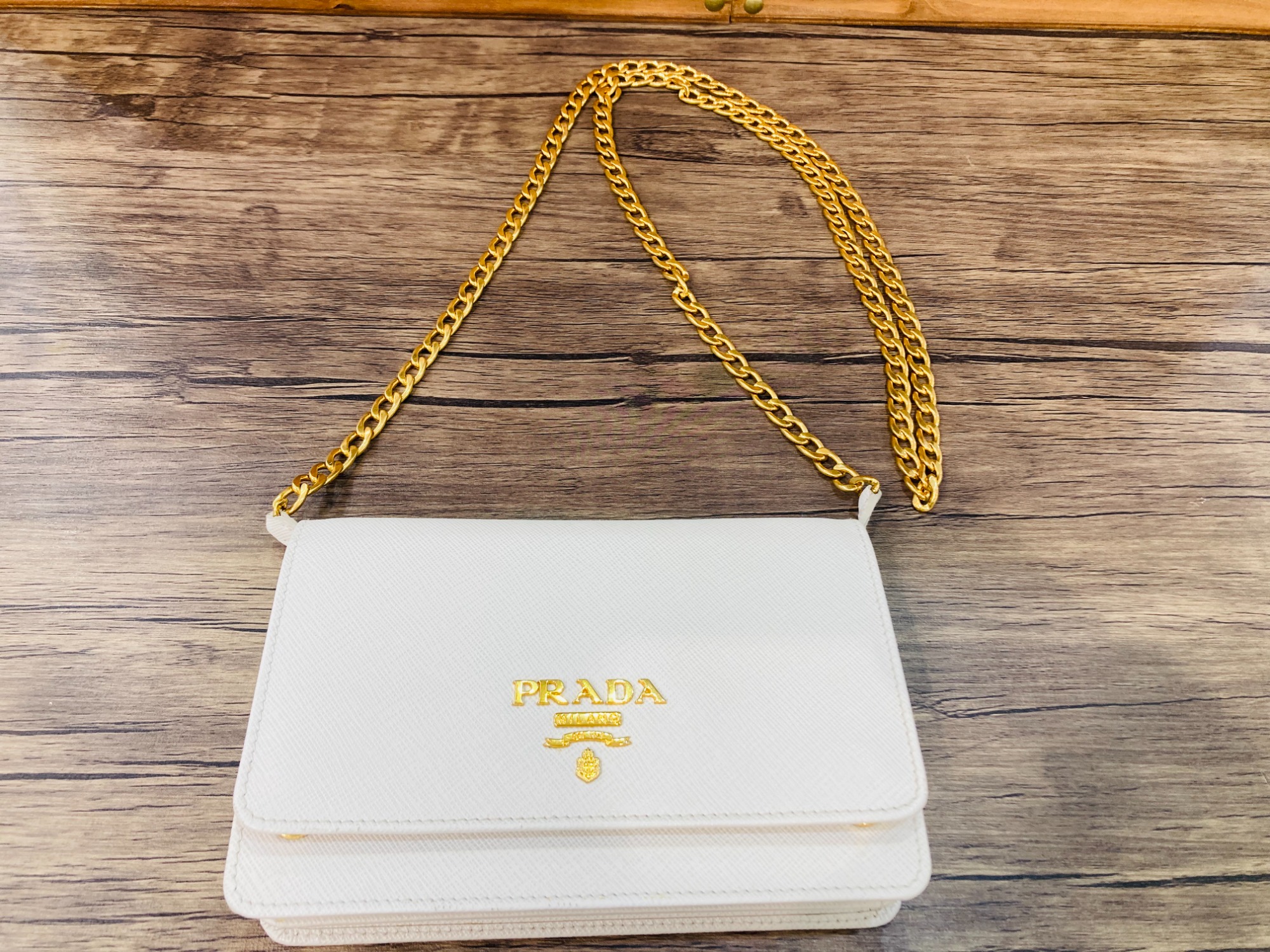 プラダの定番でもあるサフィアーノレザーを使用しチェーンストラップや正面のロゴなどからは、上品な印象が感じられるチェーンショルダーバッグでございます。サイズは、コンパクトながらファスナーポケットや複数のカードスロットを備えており、バッグだけでお出掛けも出来てしまう機能的なお品物となっております。ショルダーストラップを取り外すことで、クラッチバッグとしてもお楽しみ頂けます。