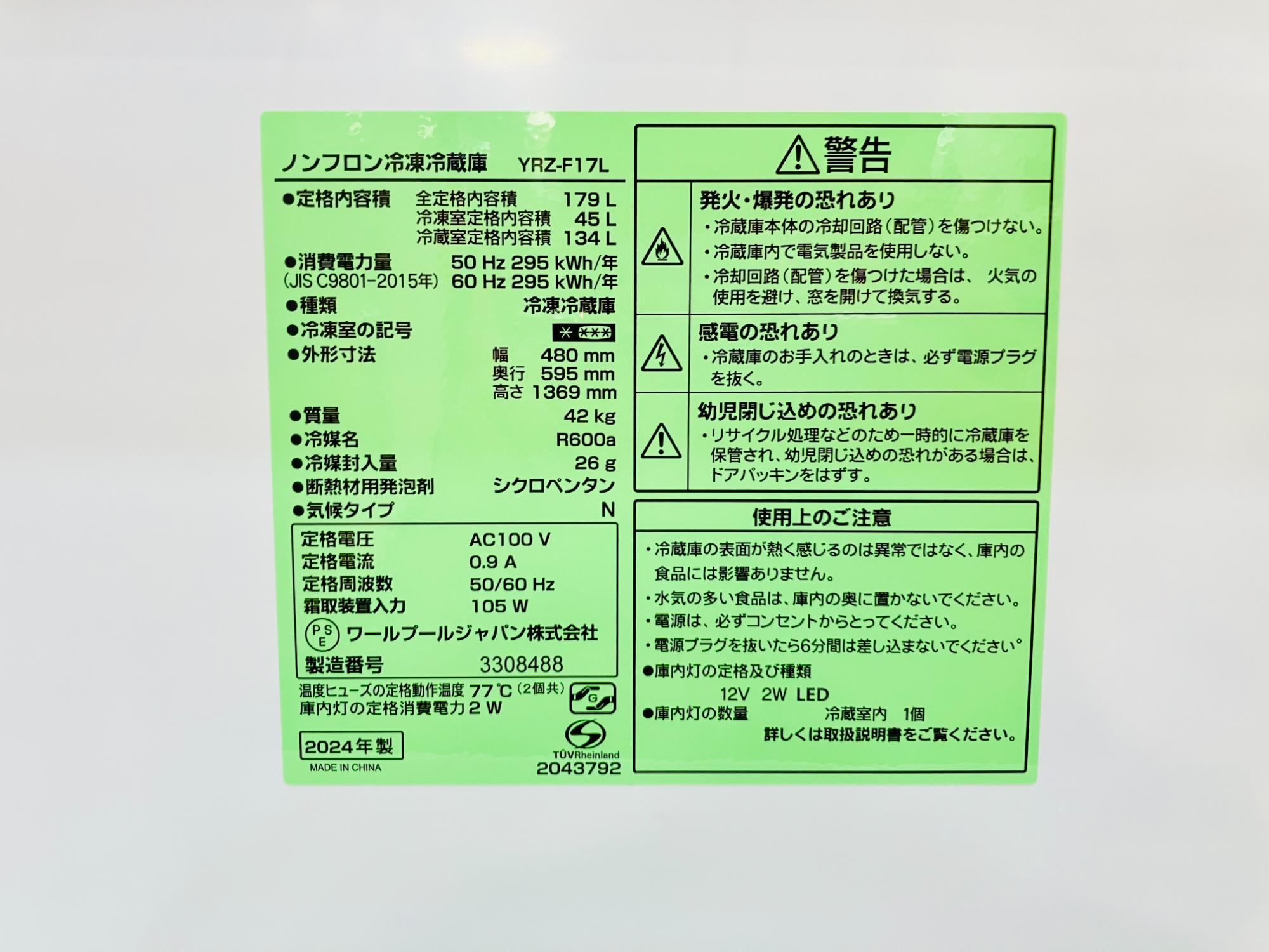 アイテム:2ドア冷蔵庫 2024年製 179L YRZ-F17L