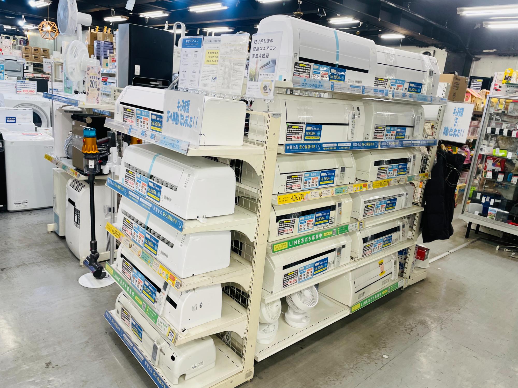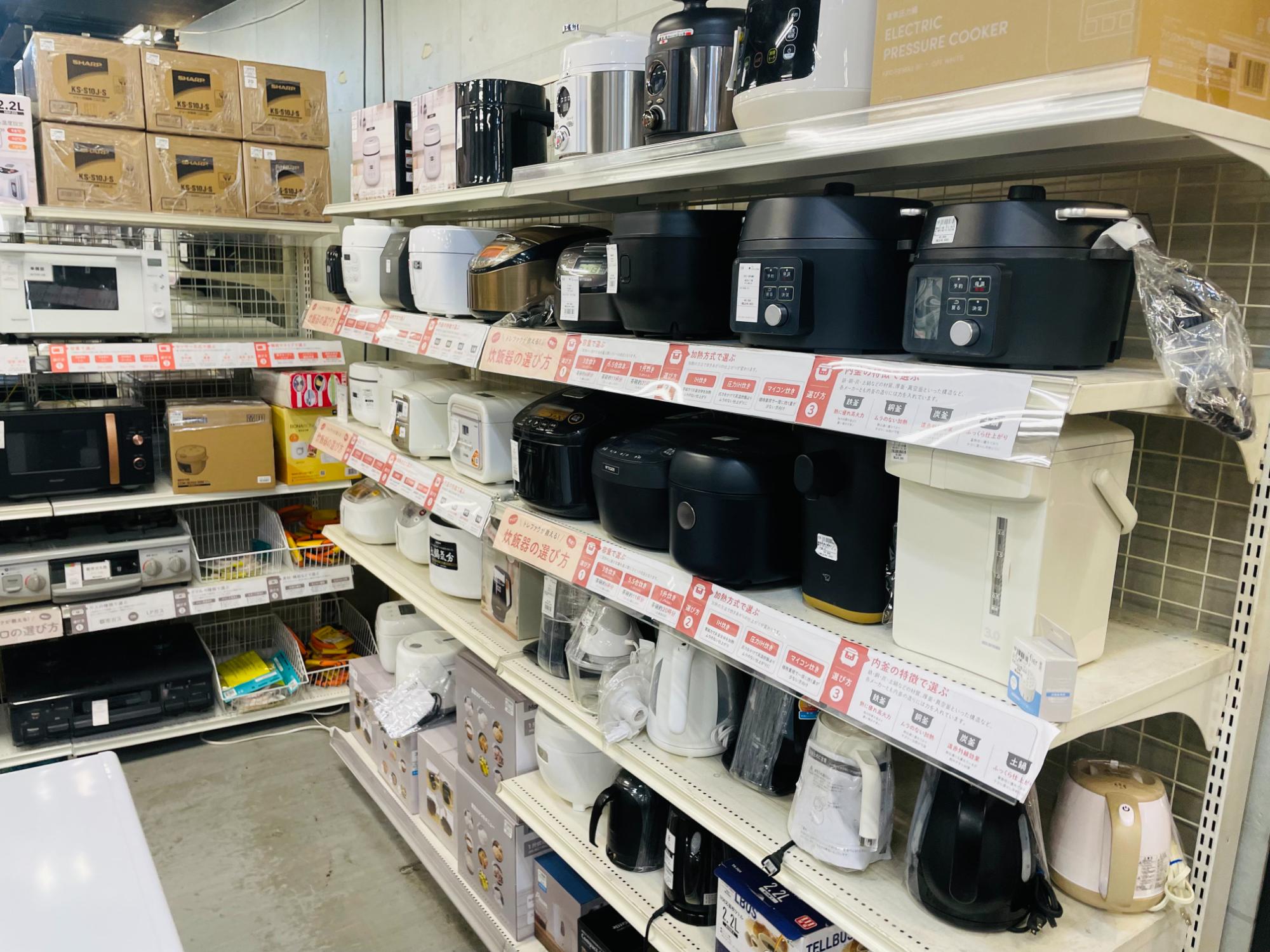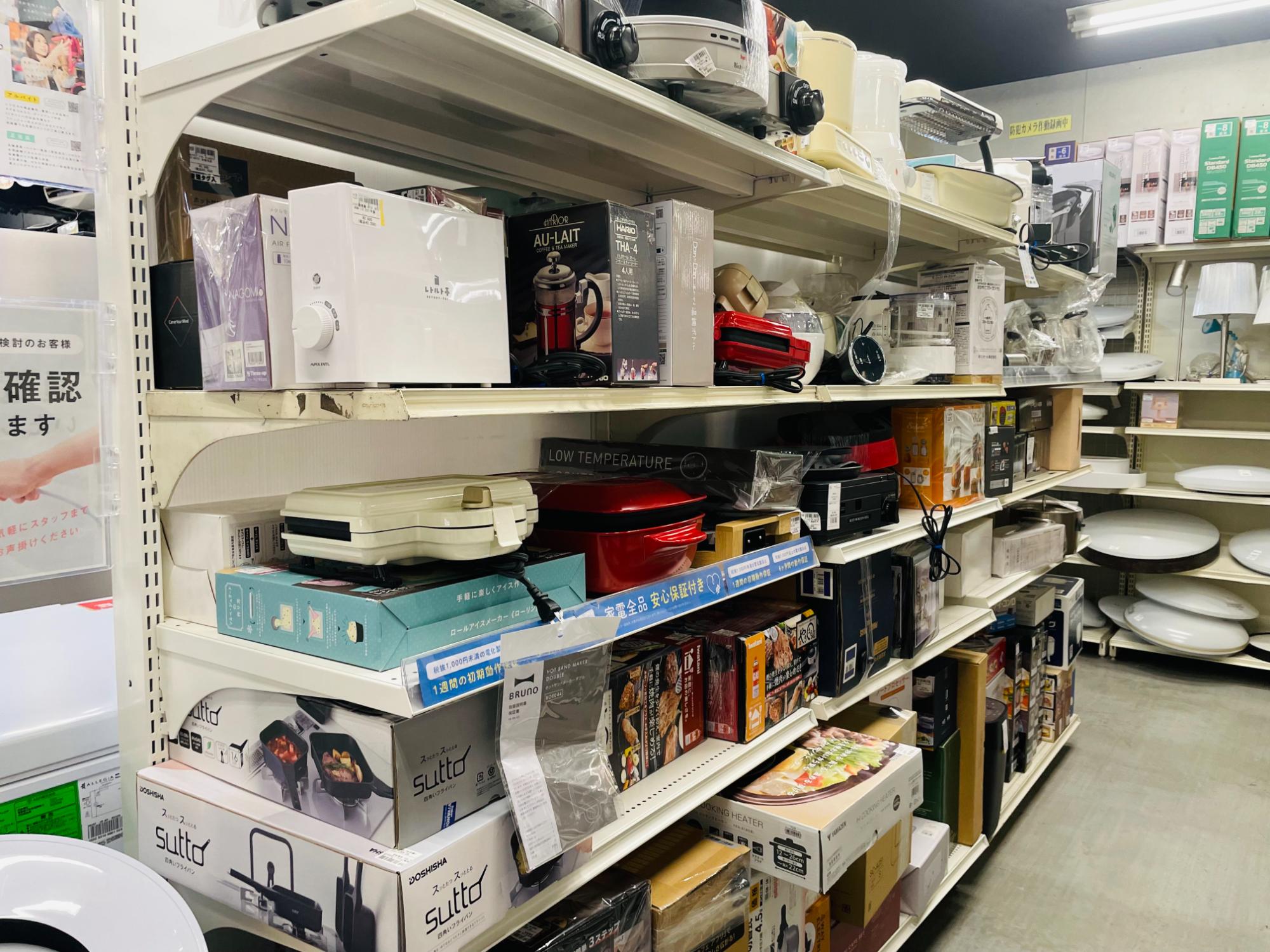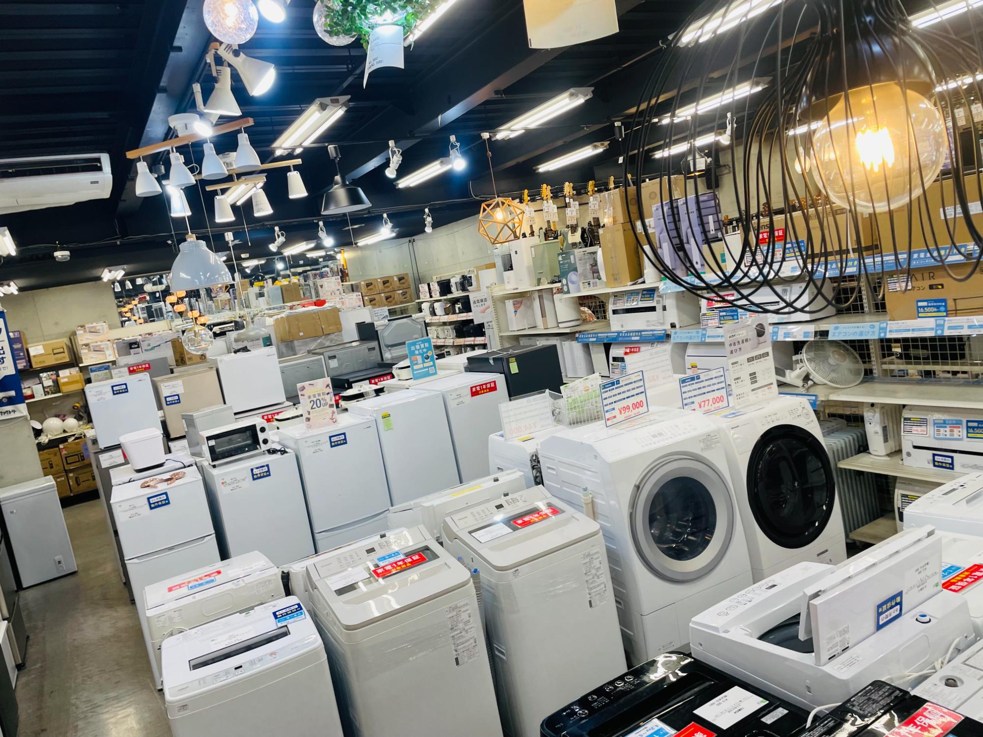 生活家電・テレビ・スマホ・デジタル家電・季節家電。2階は洋服・レディース/メンズ衣類・アメカジ古着・スニーカー・スポーツ用品・ゴルフ用品・釣り具・アウトドア用品・キャンプ用品・自転車。
