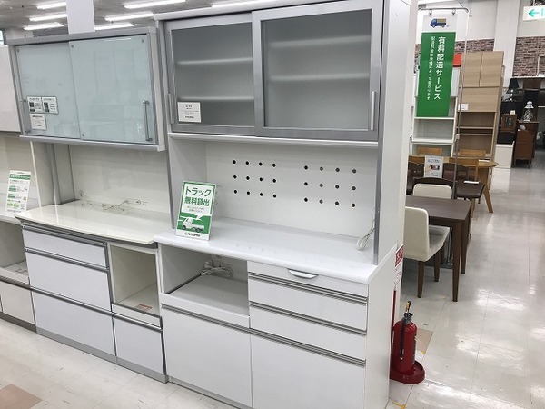 トレジャーファクトリー最大級の売場に常時40本以上の食器棚・レンジボード、15本以上のキッチンカウンター・レンジ台を展示中!