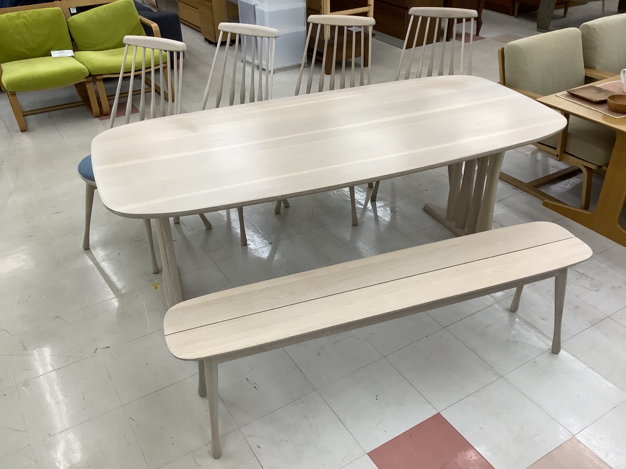 karimoku(カリモク)のベンチ付きダイニング6点セットは、美しさと実用性を兼ね備えた素晴らしい商品です。中古でも綺麗な一点ものを手に入れ、お部屋をより快適で魅力的な空間にしてみませんか?店舗で実物を見ていただけるので、ぜひお気軽にご来店ください!