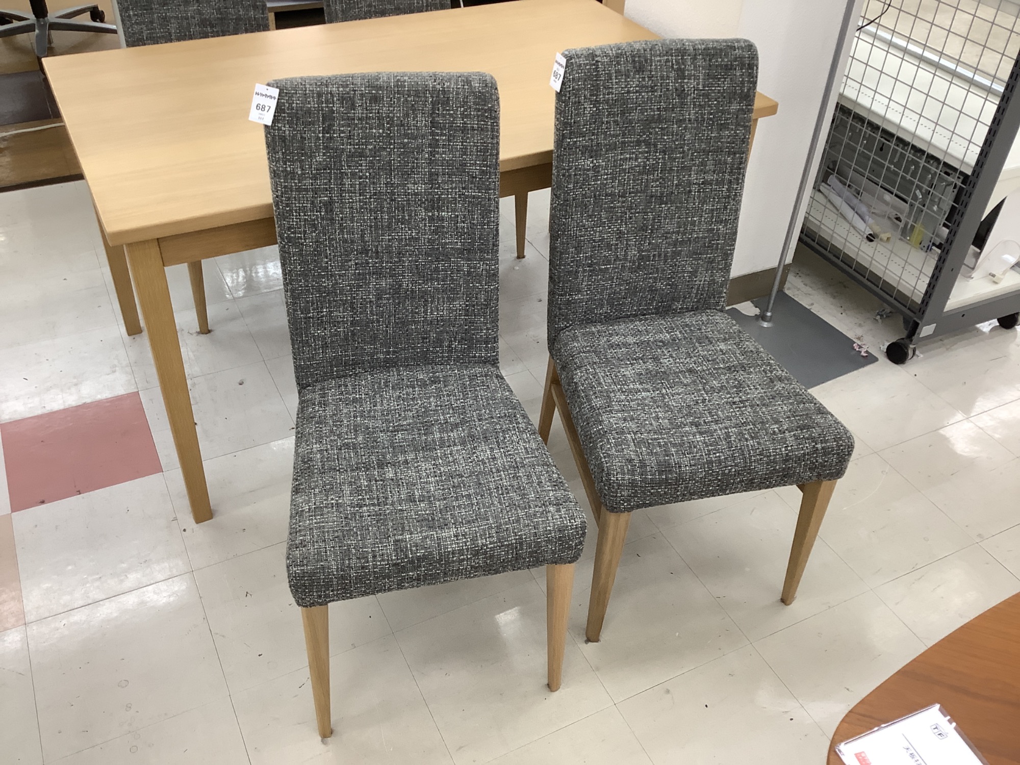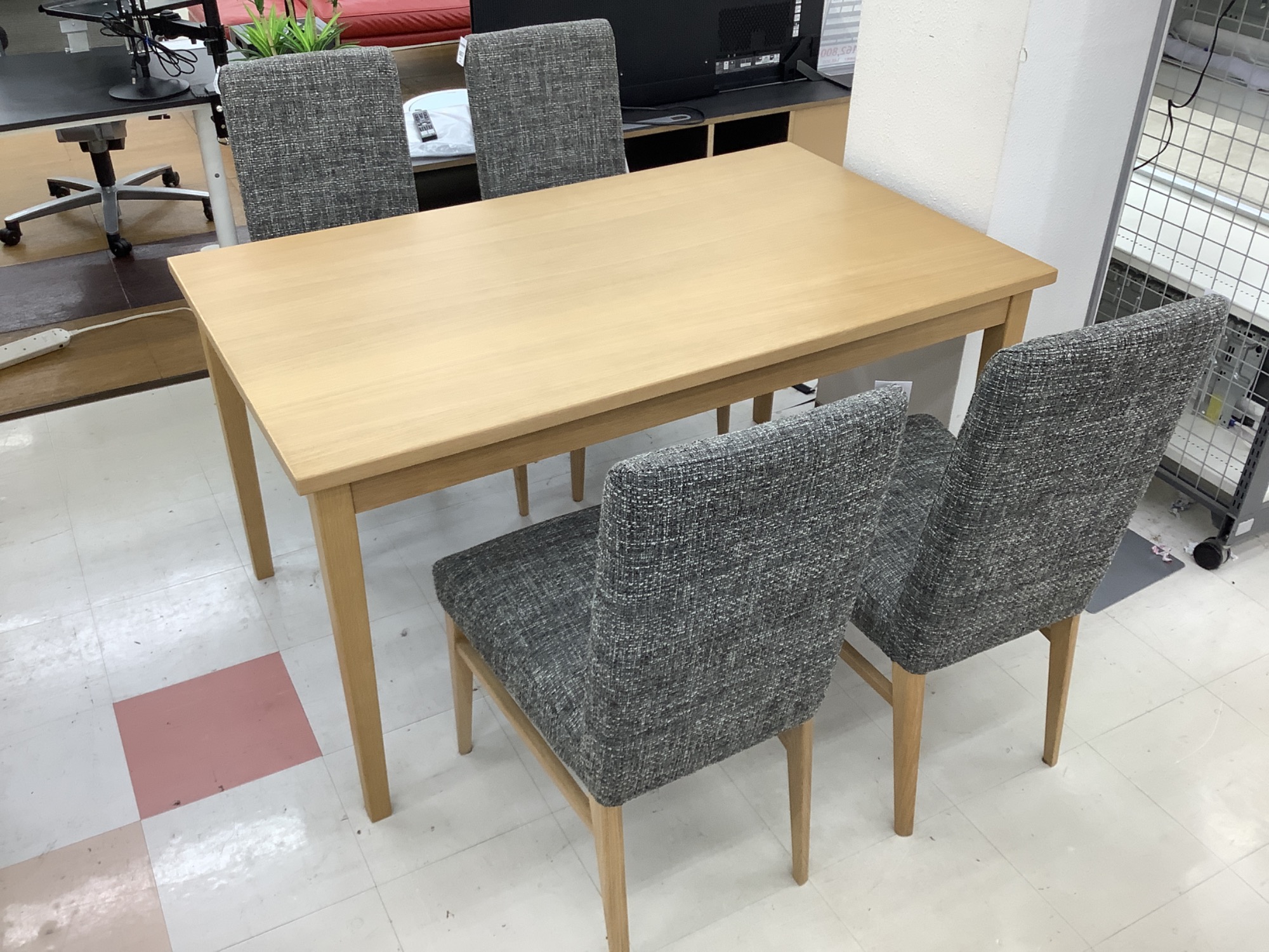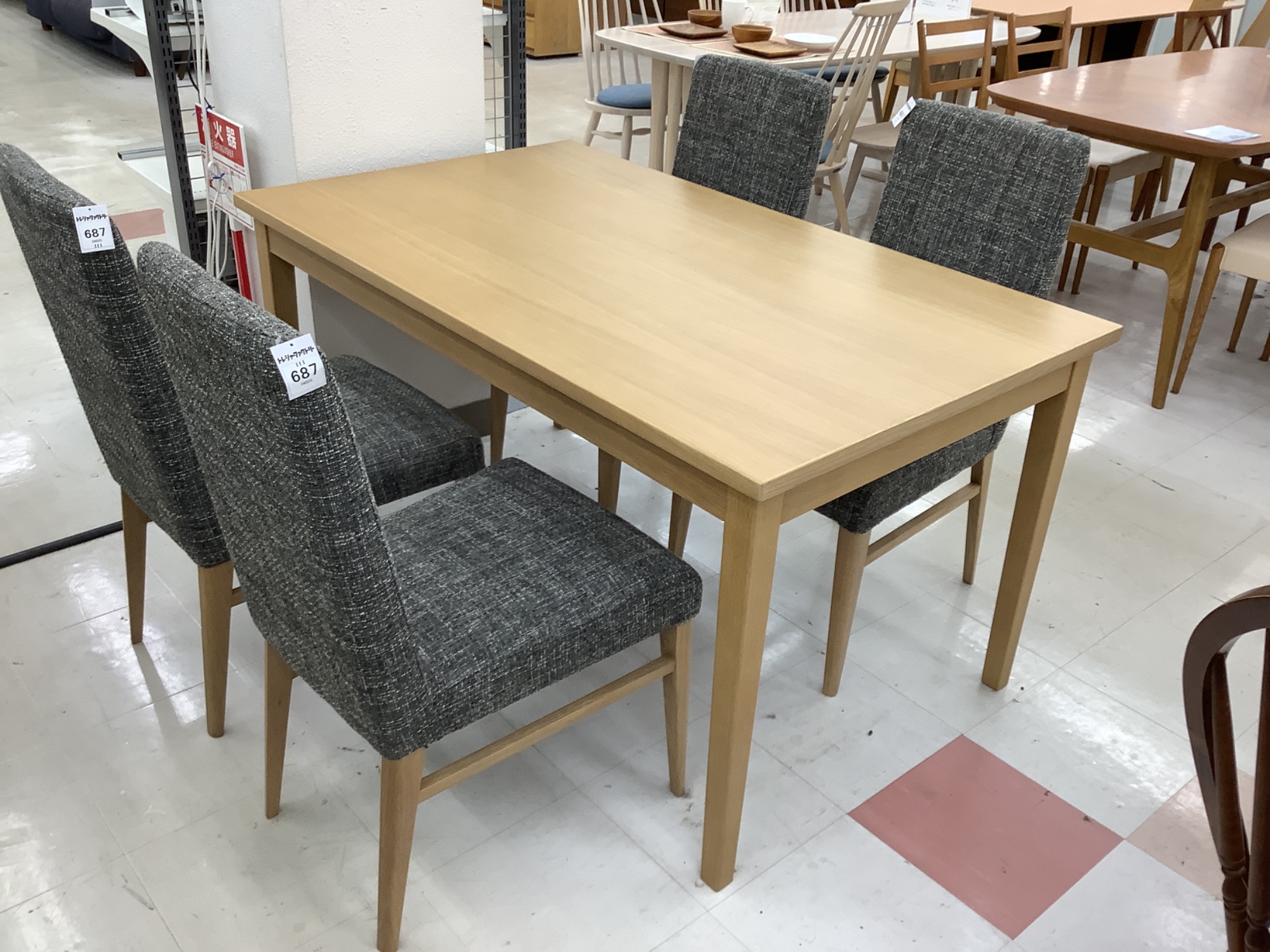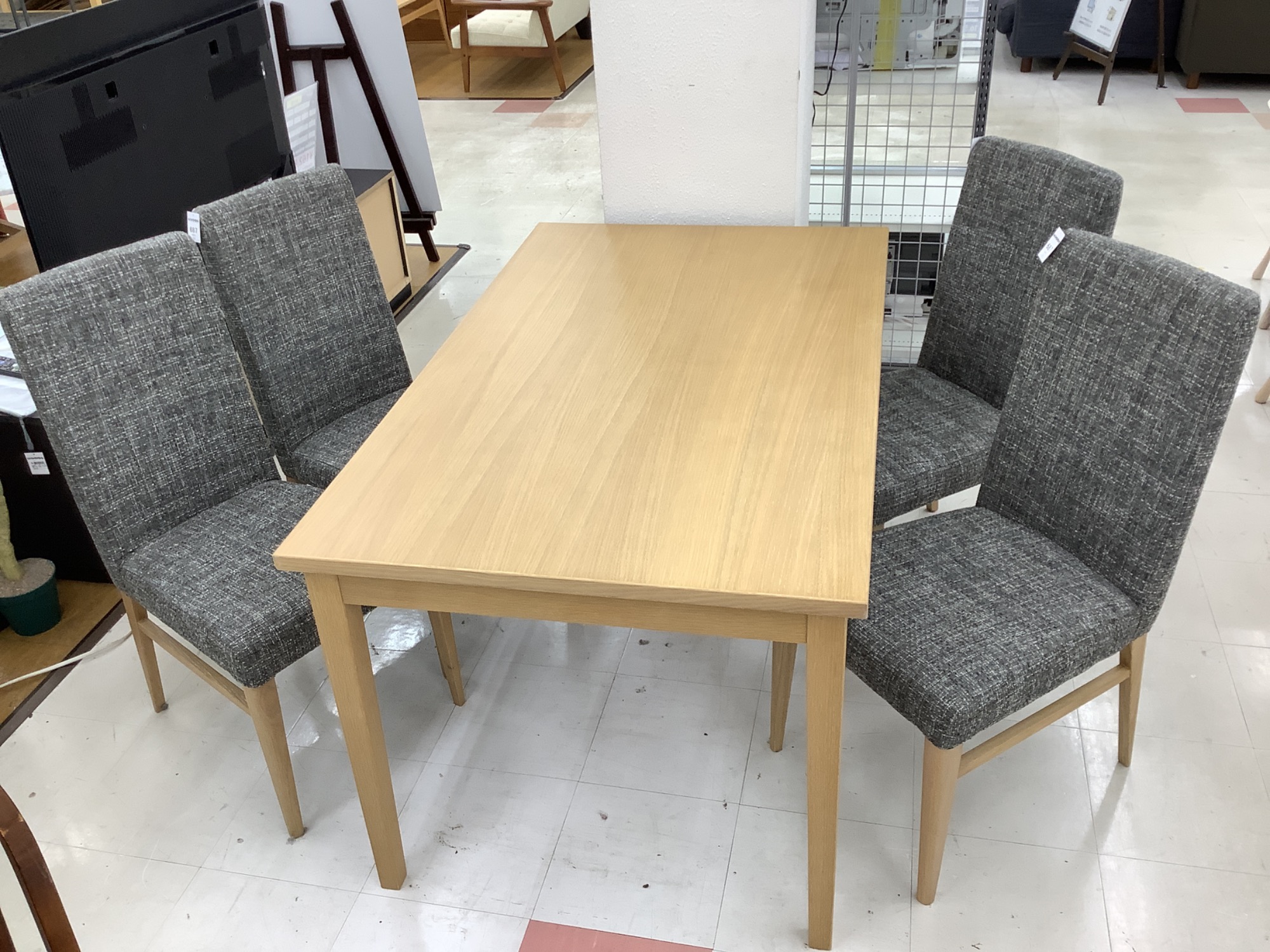 今日は当店自慢の中古家具をご紹介します。シギヤマ家具のダイニング5点セット、ナチュラル×グレーのOTTIモデルです。この商品は一点もので、特に綺麗な状態が保たれていますので、ぜひご注目ください。