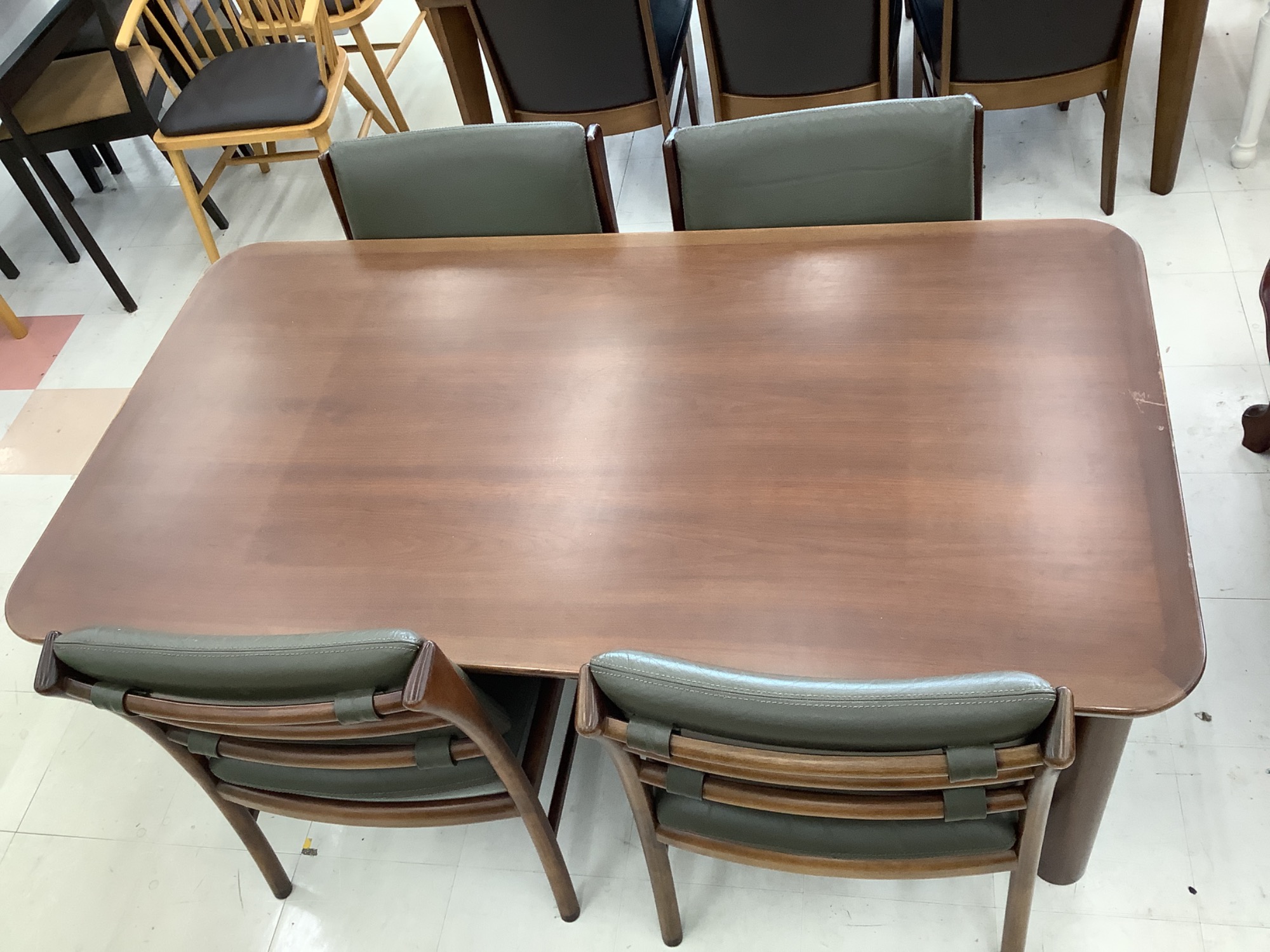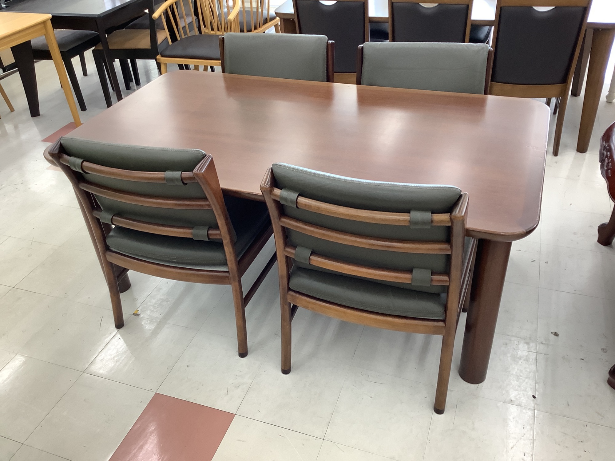 本日は、当店に新しく入荷した「日田工芸 ダイニング5点セット」をご紹介いたします。このセットは、木のぬくもりを感じられるブラウンと、上品なグリーンのカラーが特徴的な一点ものです。