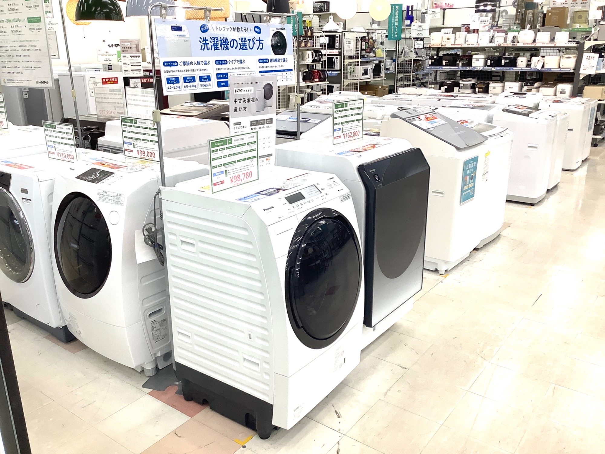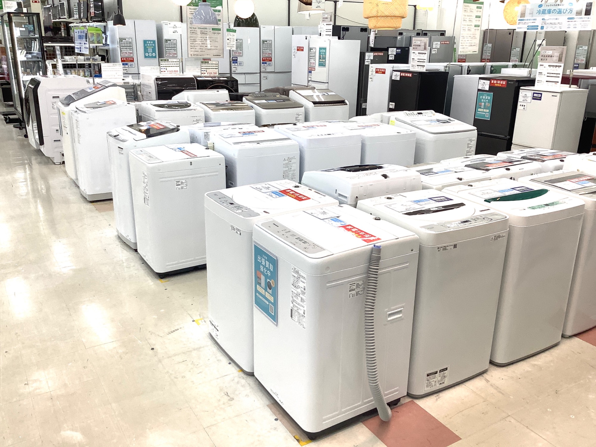 全店ナンバー1の展示台数を誇る洗濯機売り場。最大1年間の動作保証つき