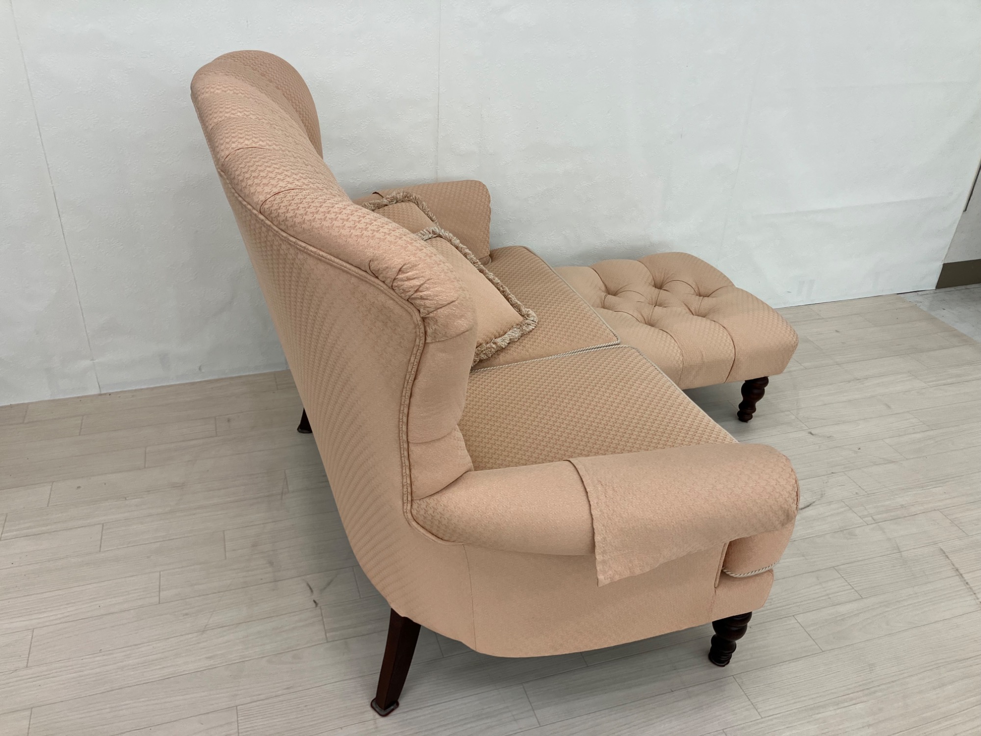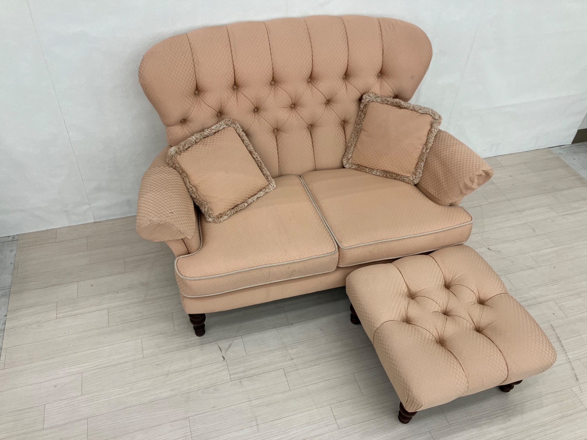 レトロで背もたれのボタン止めのデザインが可愛らしいオットマン付2人掛けソファ!