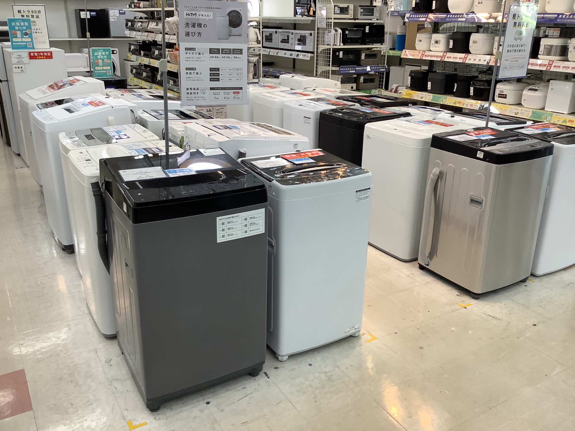 トレファク最大級の展示数を誇る家電製品売り場のご紹介です!最大1年間の動作保証つき!