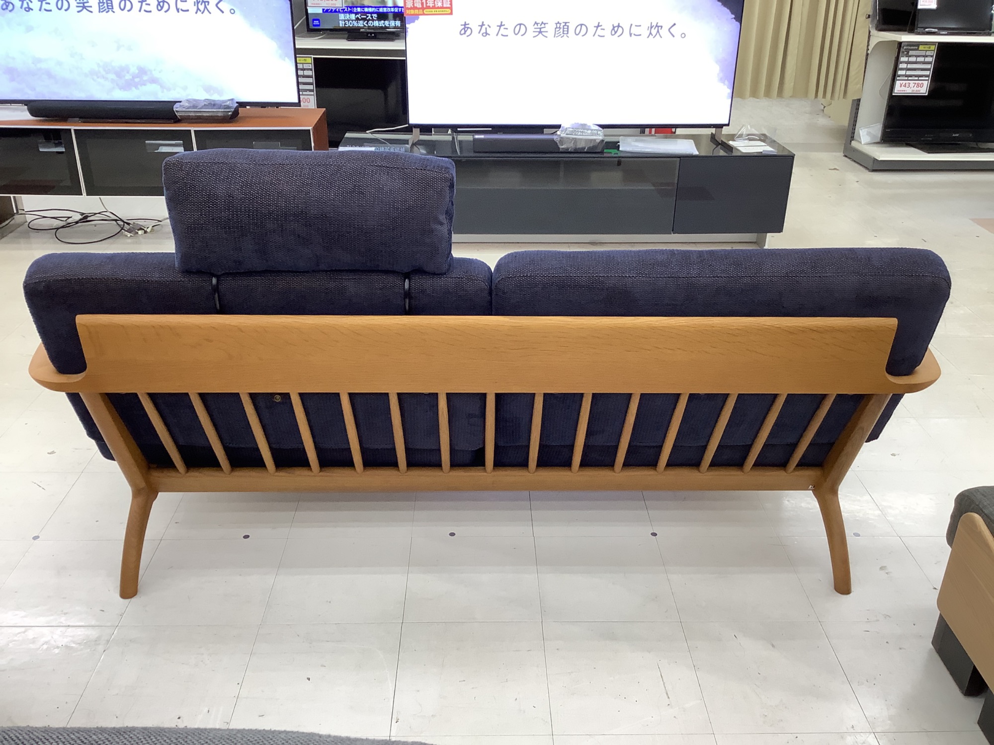 「セオト ソファ 3P」は、ネイビーのシックな張地とナチュラルな木製フレームのコントラストが絶妙です。シンプルでありながらエレガントなデザインは、どんなインテリアにも自然に溶け込み、お部屋全体を格上げします。