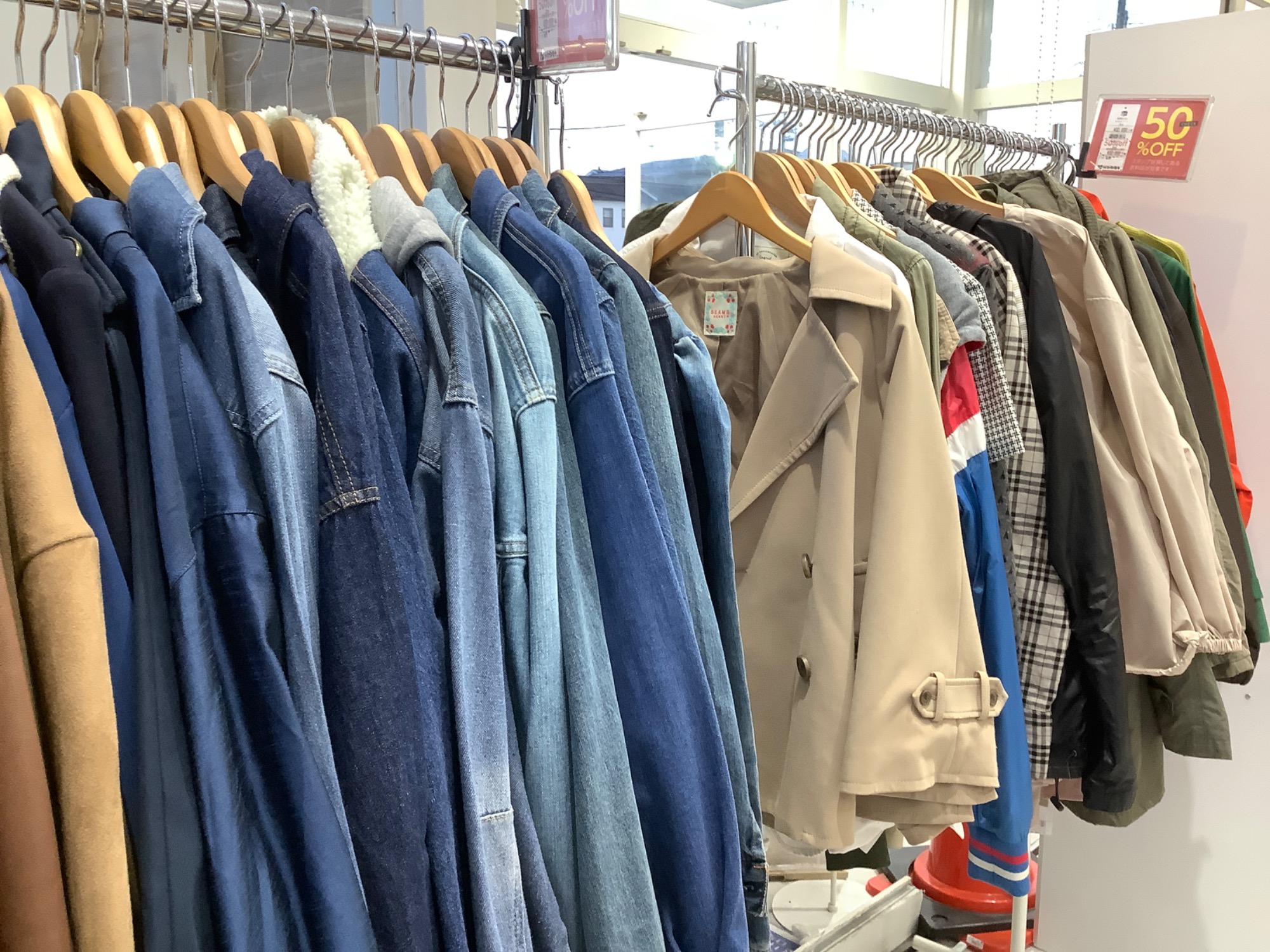 出入口横のセールコーナーではライトアウターが50%オフとなっております!
