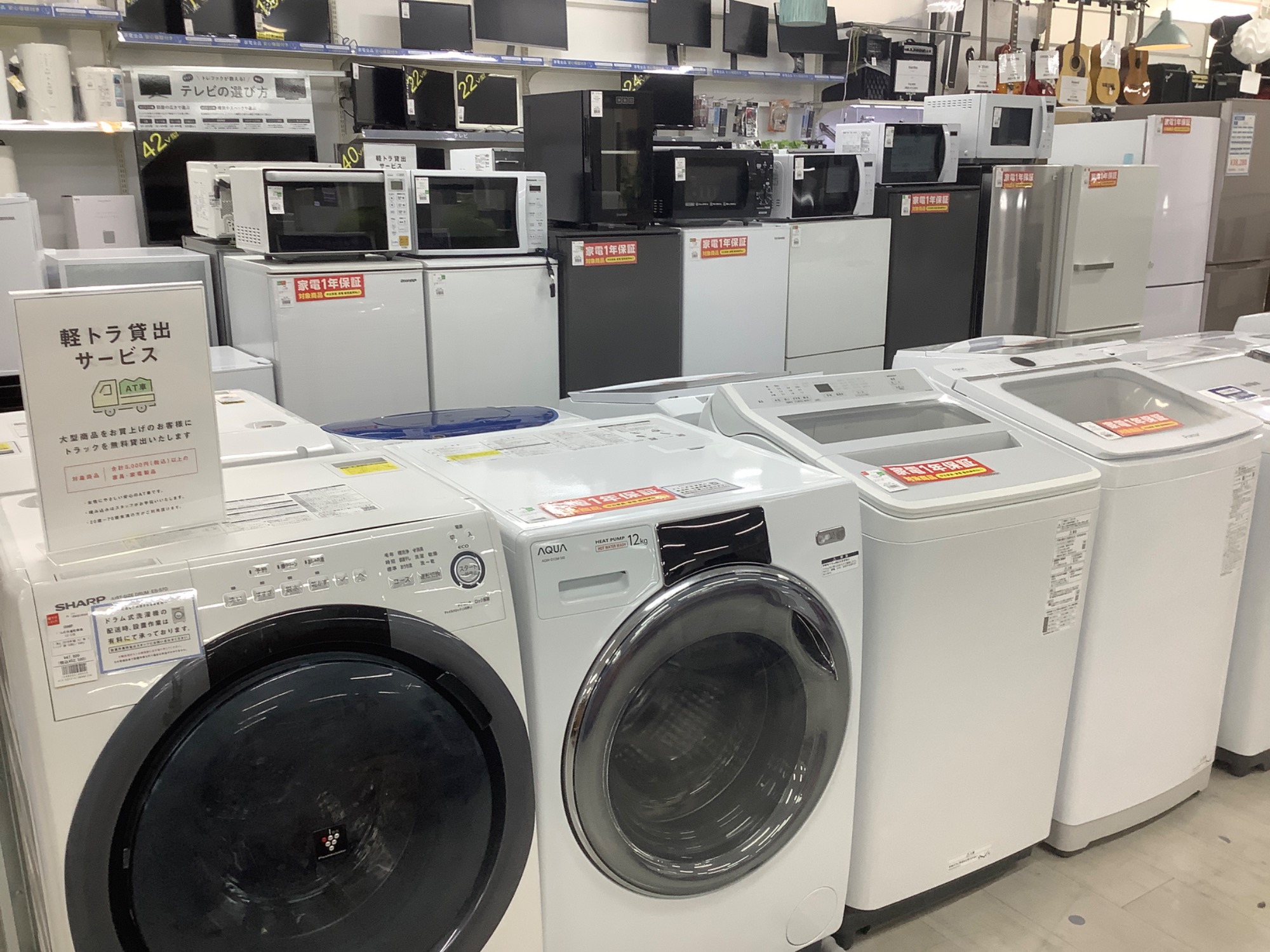 他にも単身向けのコンパクトな洗濯機や電子レンジ、ガステーブル、テレビ、冷蔵庫などなど2階に幅広く取り揃えております!