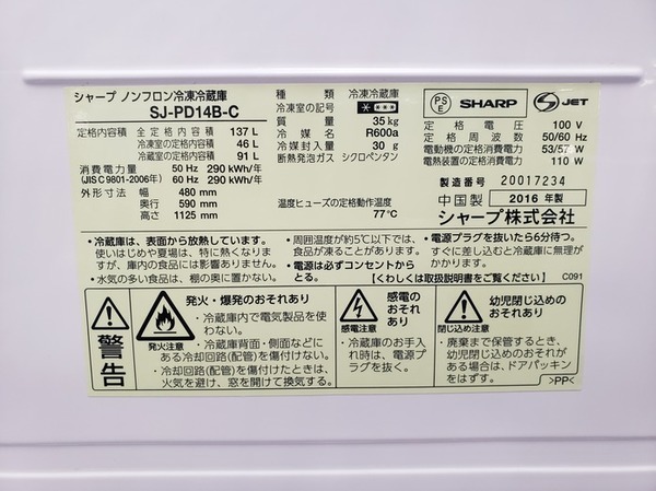 アイテム名:2ドア冷蔵庫(SJ-PD14B-C)