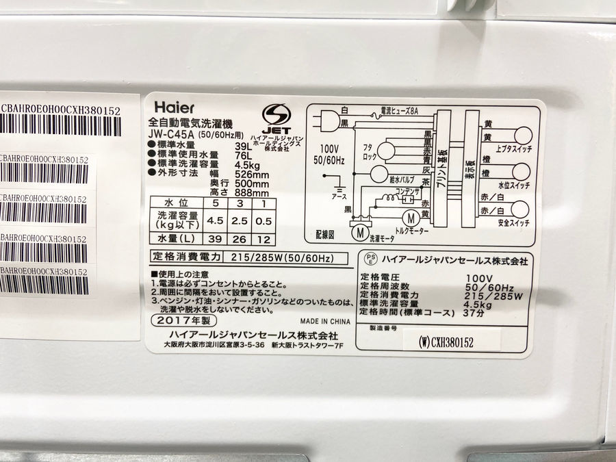 アイテム名:全自動洗濯機(JW-C45A)