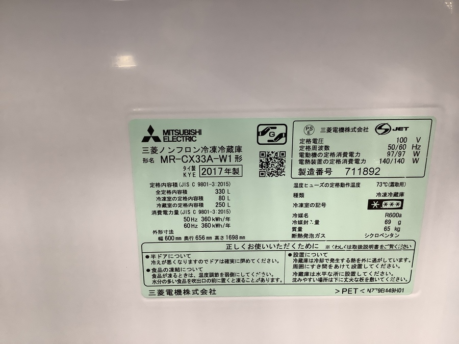 MITSUBISHI(ミツビシ)3ドア冷蔵庫 MR-CX33A-W1 2017年製 買取入荷いたしました【藤沢店】
