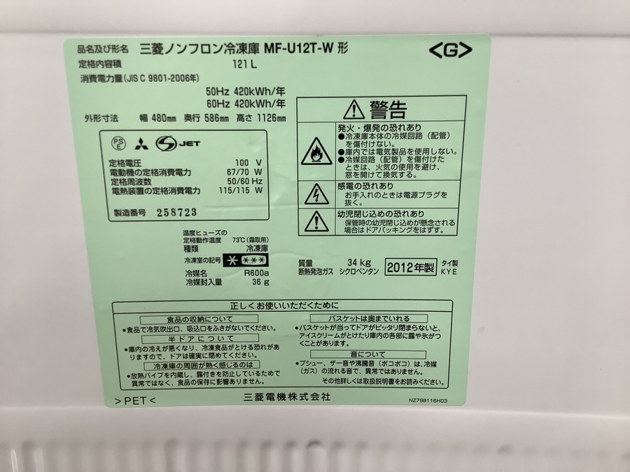 2012年製 MITSUBISHI(ミツビシ)の1ドア冷凍庫 MF-U12T を買取入荷しました!