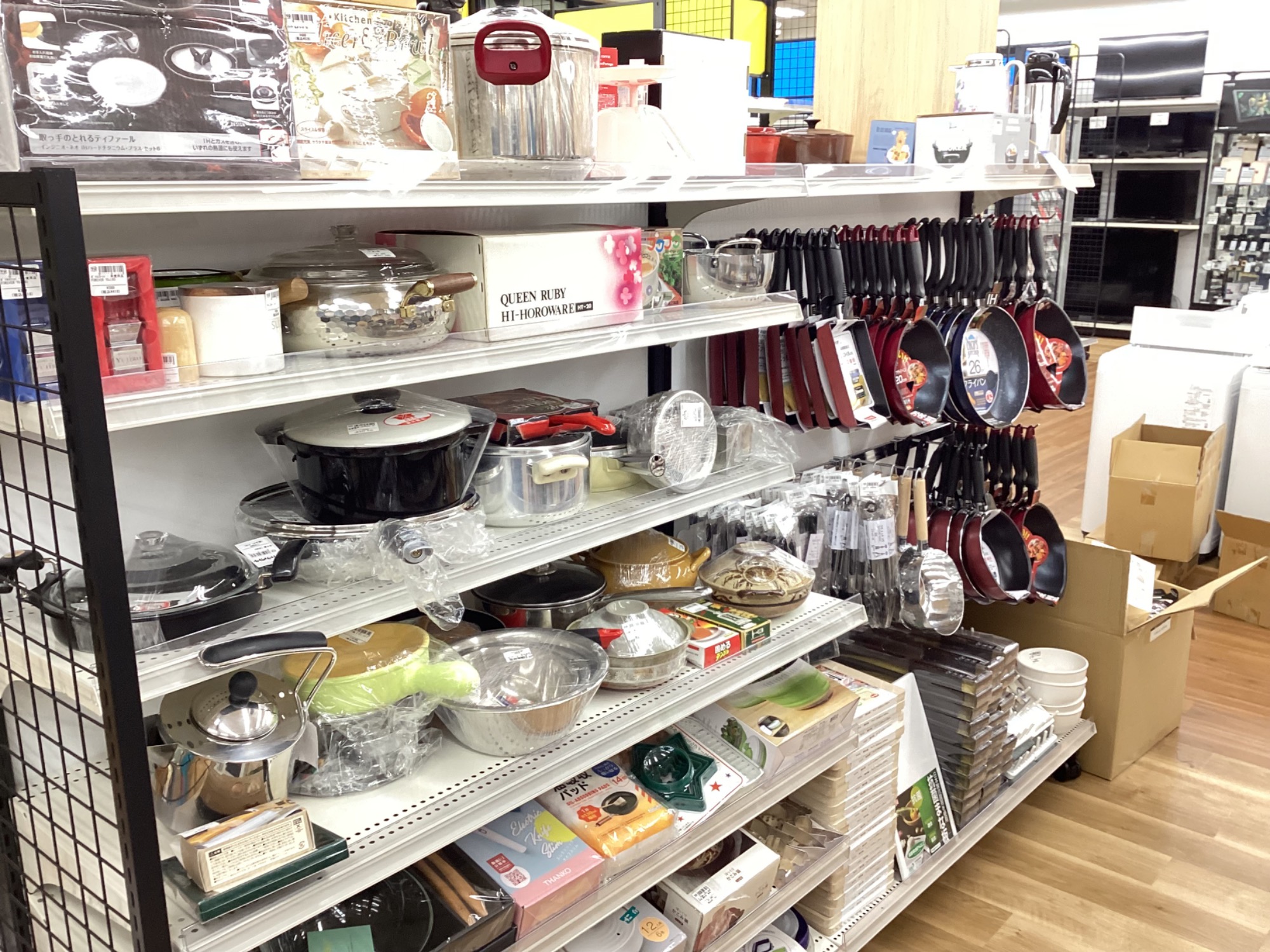 フライヤパンや両手鍋、まな板などのキッチン雑貨類。
