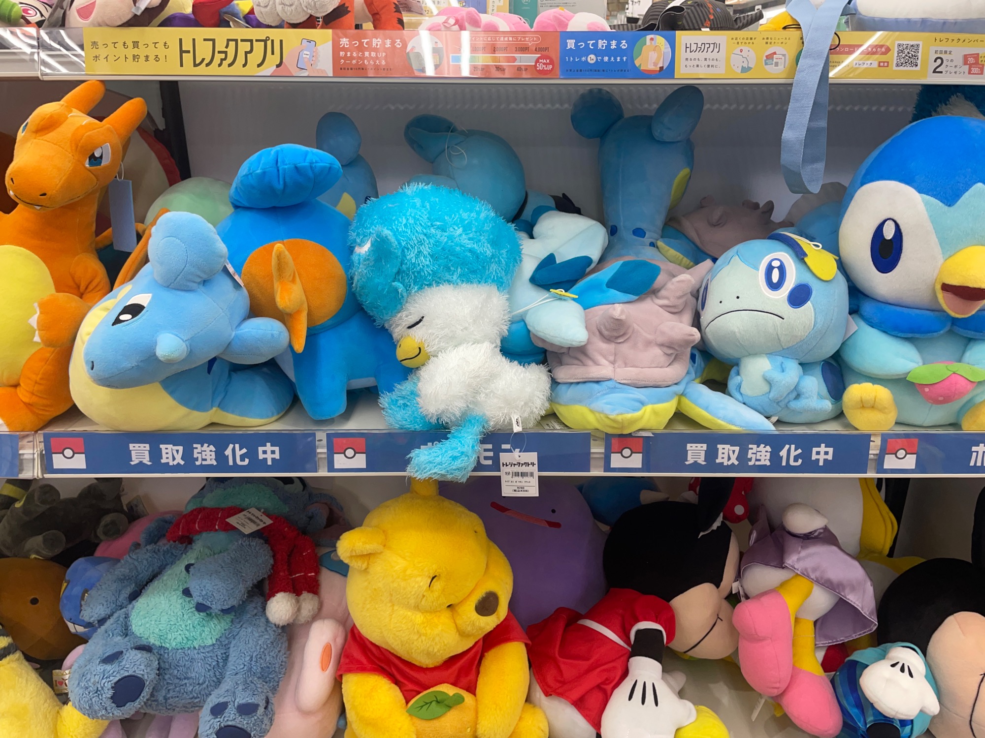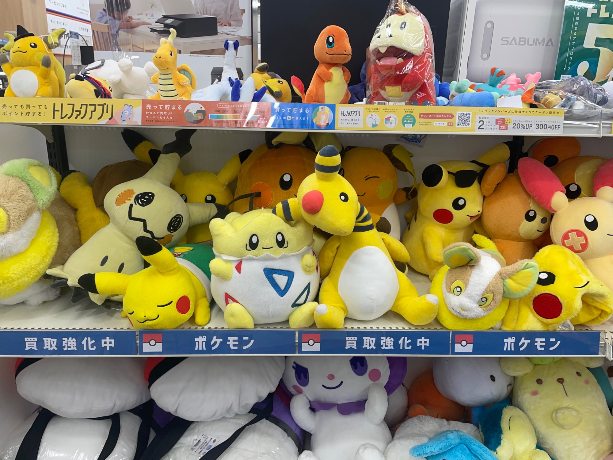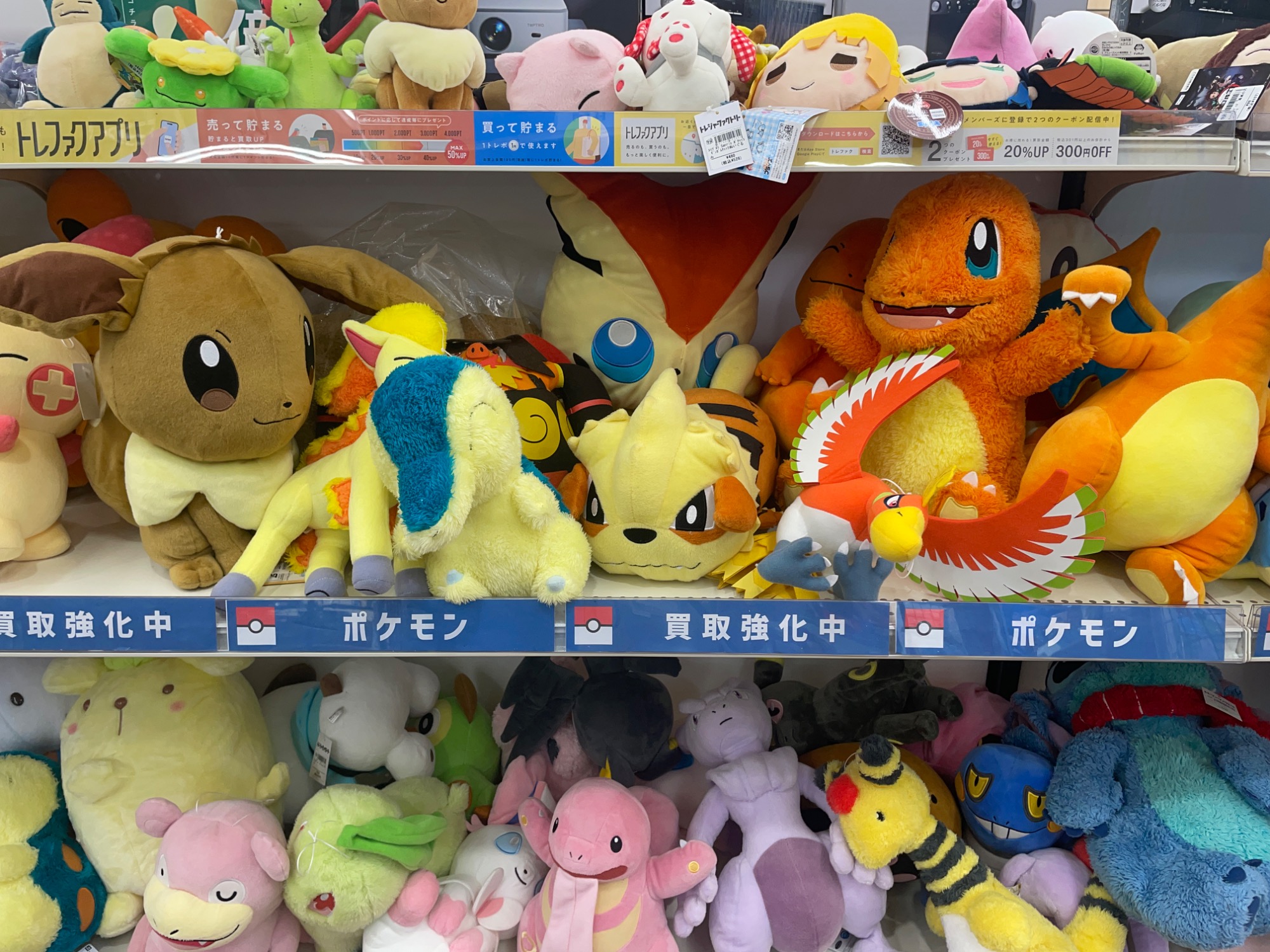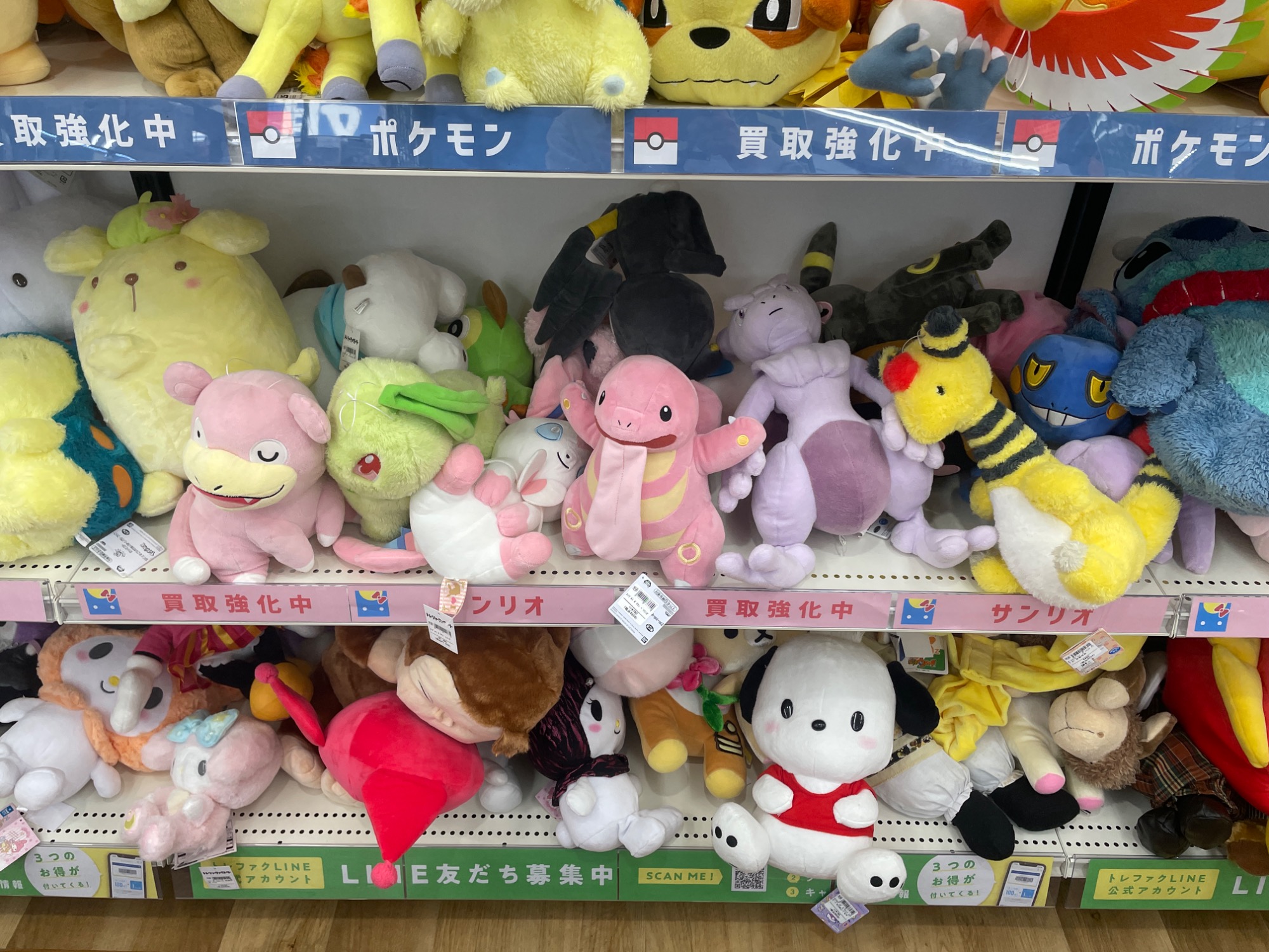 週末は特に家族連れのお客様に人気で、特にポケモンヌイグルミは一番人気!!横浜にポケモンセンターもあることからお持ち込み頂く事も多く、たくさんの種類がございます!