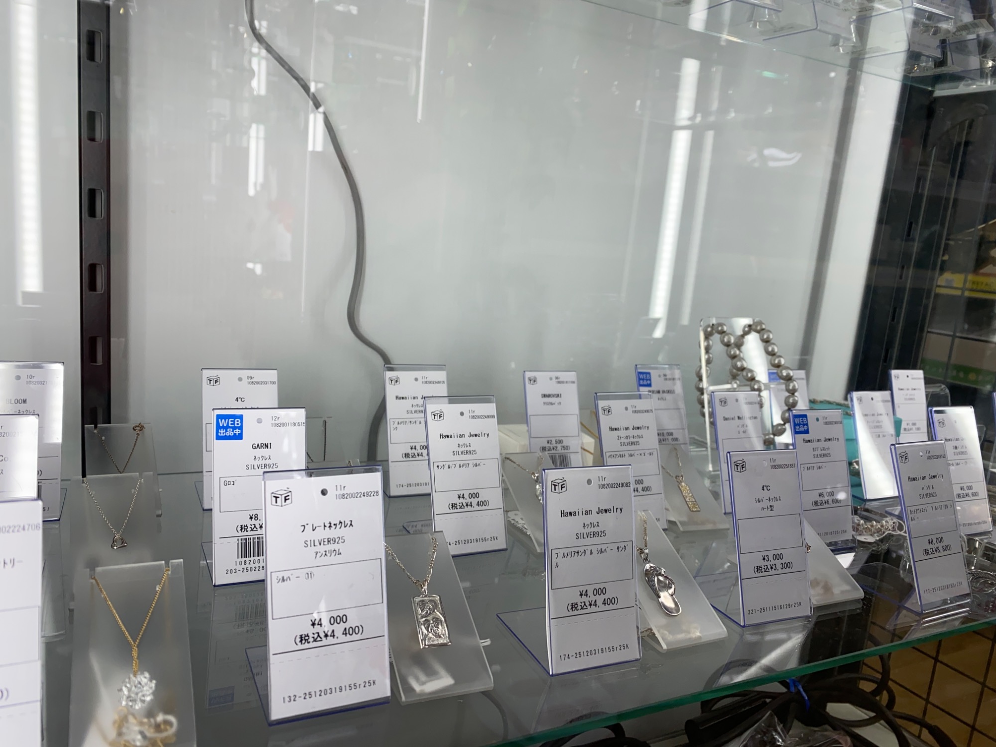続いて、アクセサリー類のご紹介です。こちらのショーケースでは、ハワイアンジュエリーが多数展示されております。