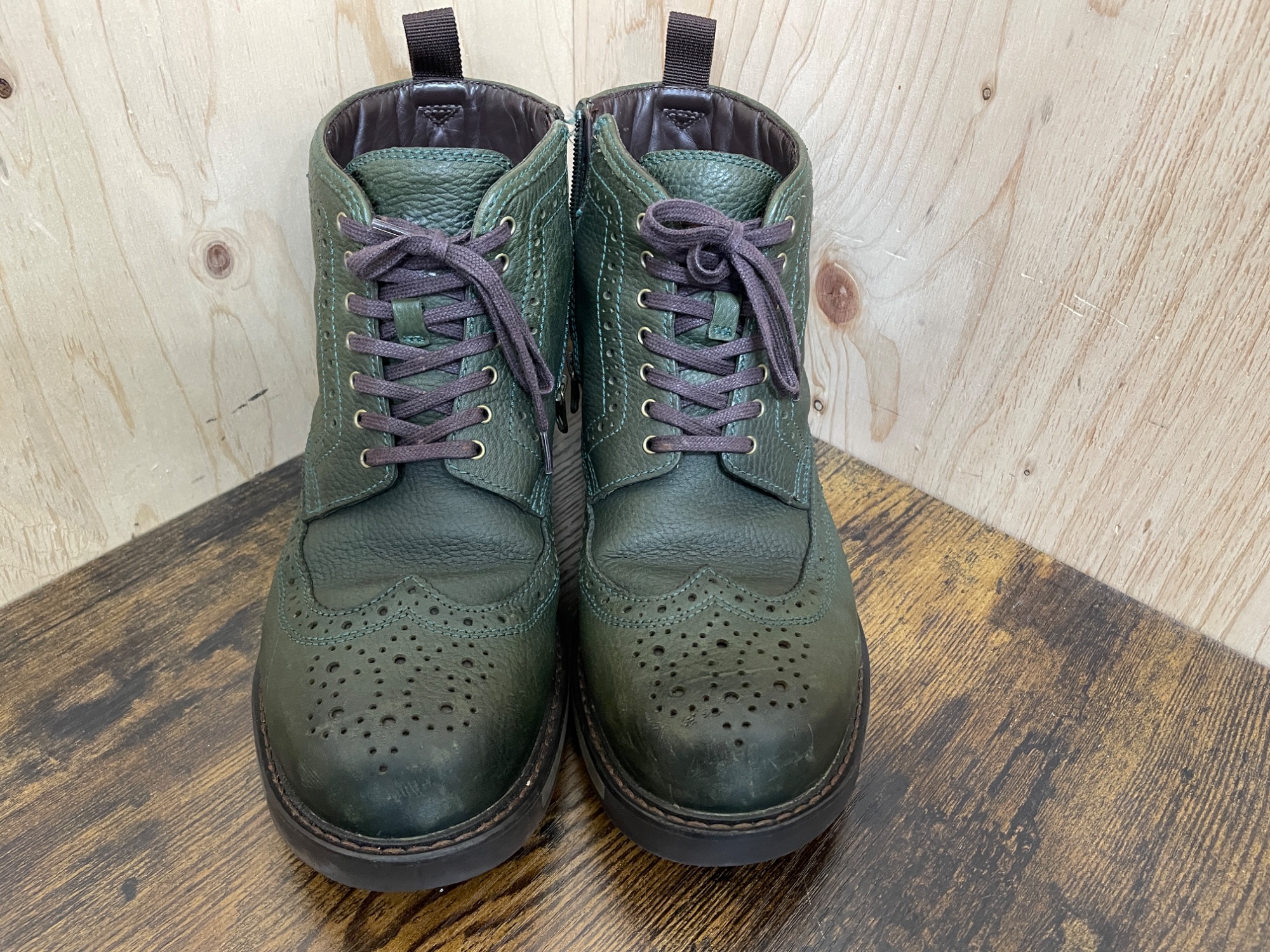 オリーブカラーのカウレザーアッパーにフラウンシューレス。