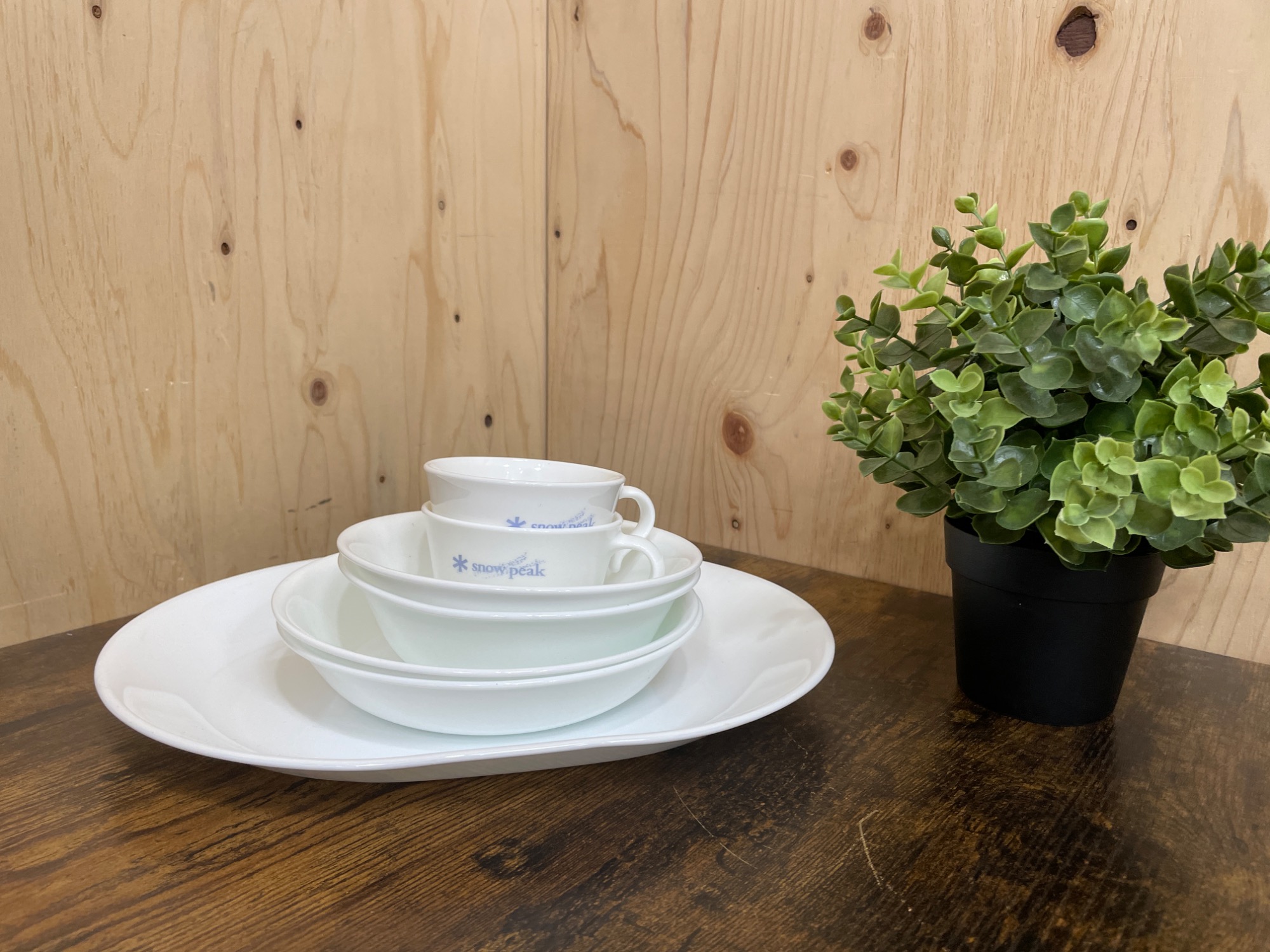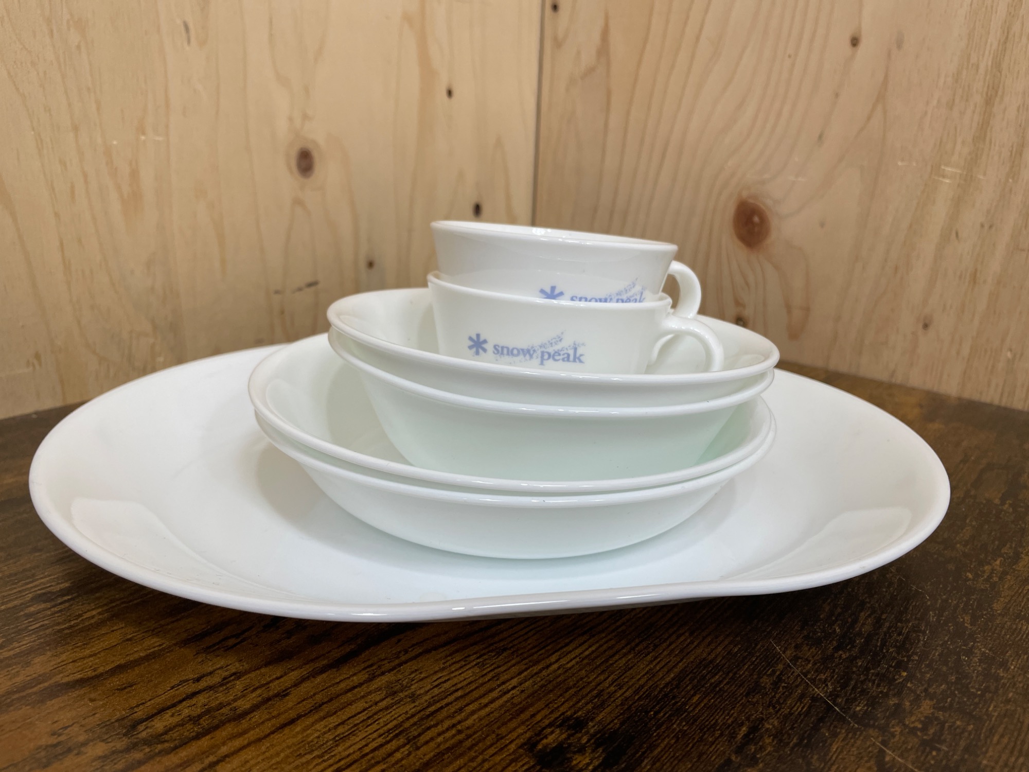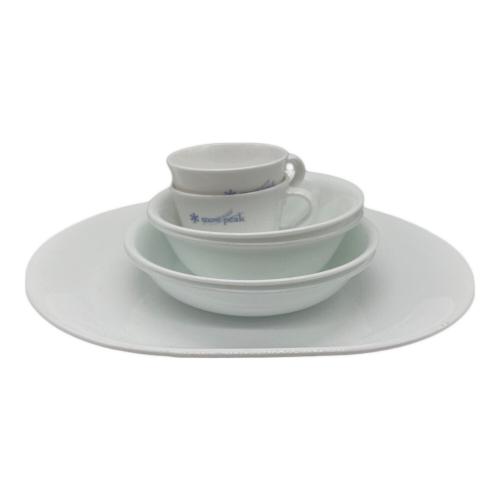 今回ご紹介するアイテムは、こちらの食器セットです。日本のアウトドアブランドであるSnow peak(スノーピーク)と、アメリカの食器ブランドであるCORELLE(コーレル)がコラボした商品となっております。
