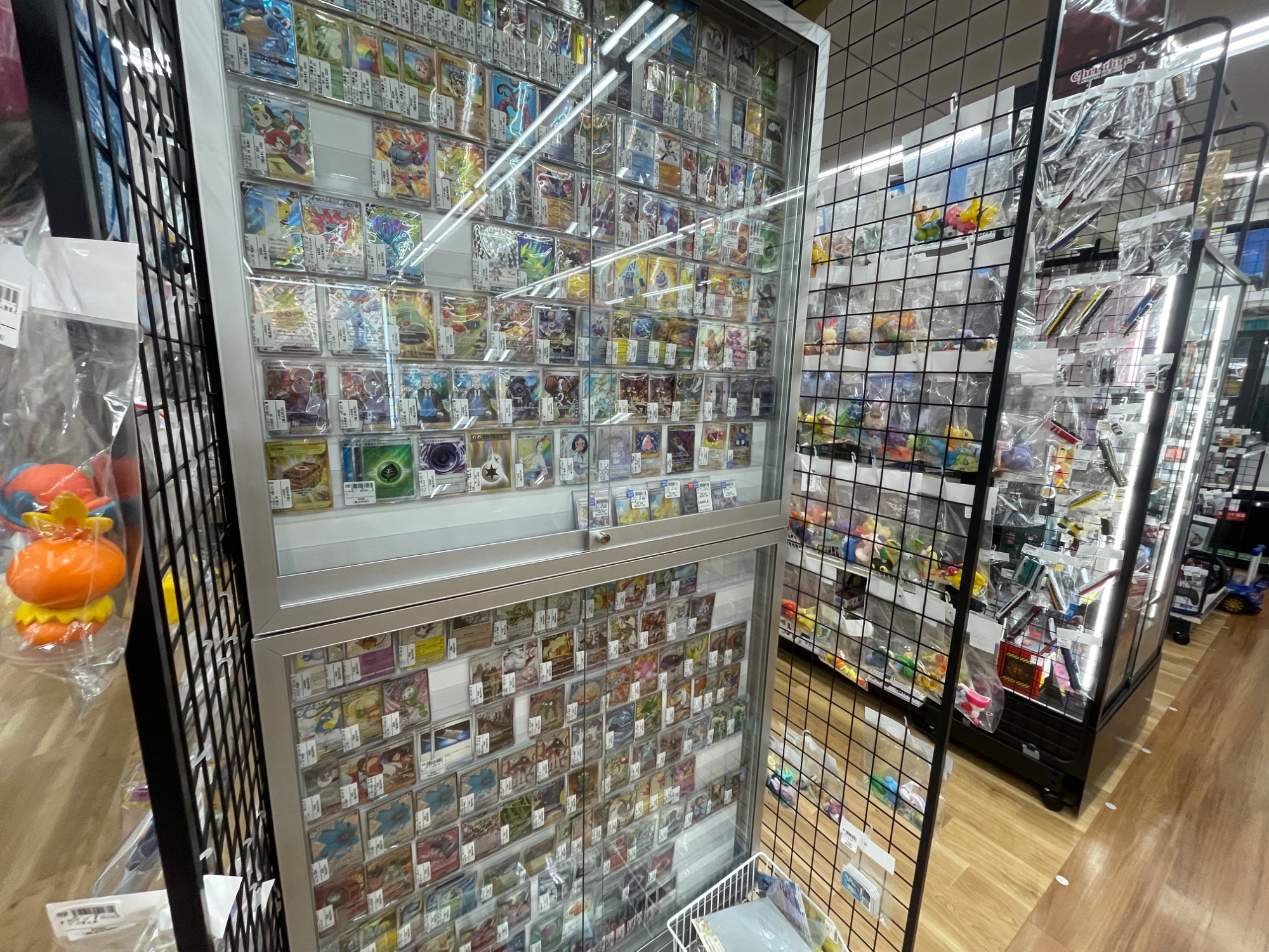 まずは、ポケモンカードコーナーのご紹介です。ARやRRのカードは勿論、ブロックパック等もお取り扱いしております。ショーケース内には、現在では入手困難なカードも多数。是非、店頭にてご覧くださいませ。