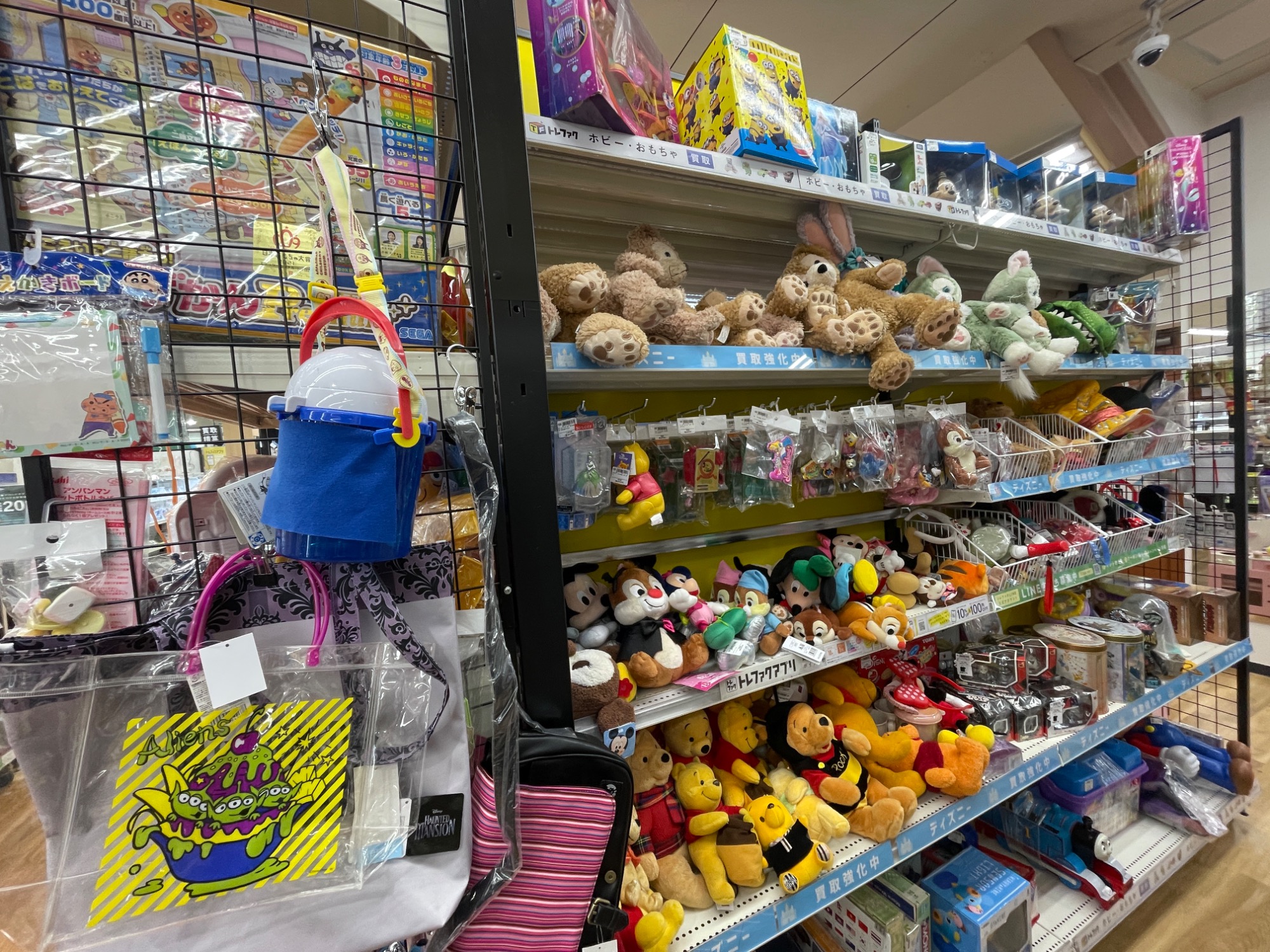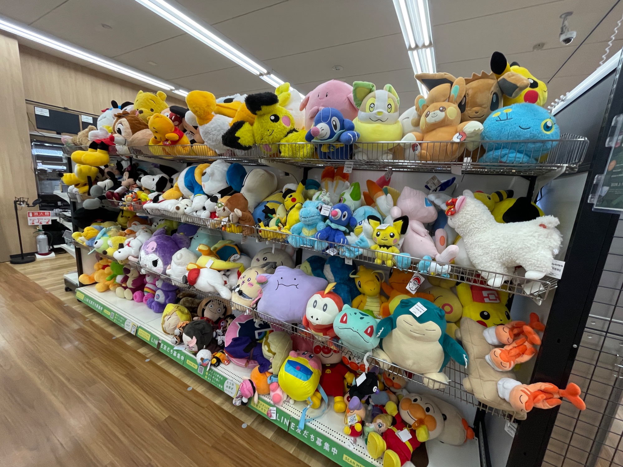 最後は、ぬいぐるみコーナーです。ポケモンやディズニー、サンリオなどのキャラクターのぬいぐるみを多数お取り扱いしております。売り場はとってもカラフルで、見ているだけでも楽しい空間となっています。