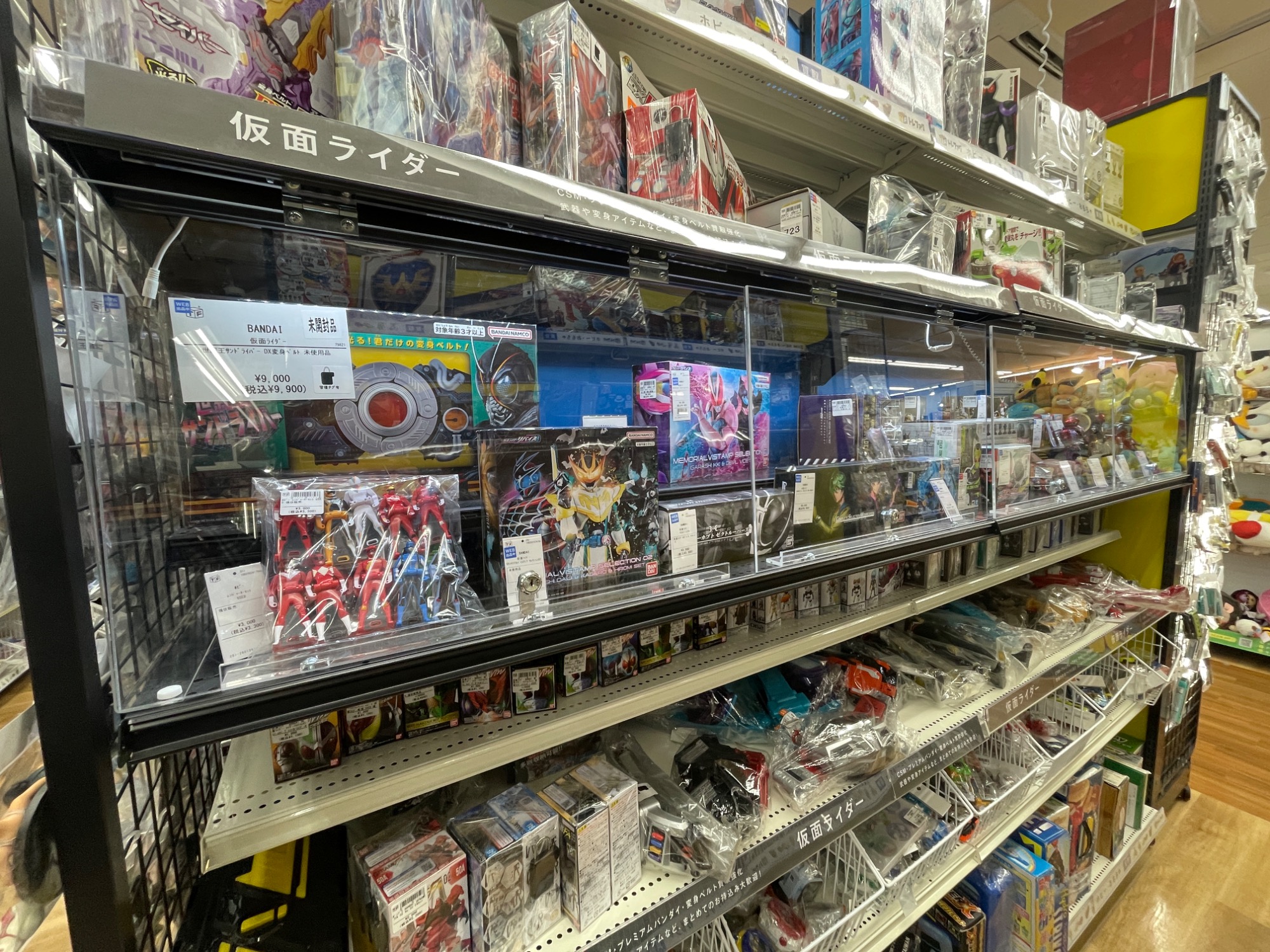 お次は、仮面ライダーコーナーです。変身アイテムや武器玩具の他、フィギュアなどもお取り扱いしております。カゴにまとめられたコレクションアイテムコーナーでは、思わぬアイテムに出会えることも…。