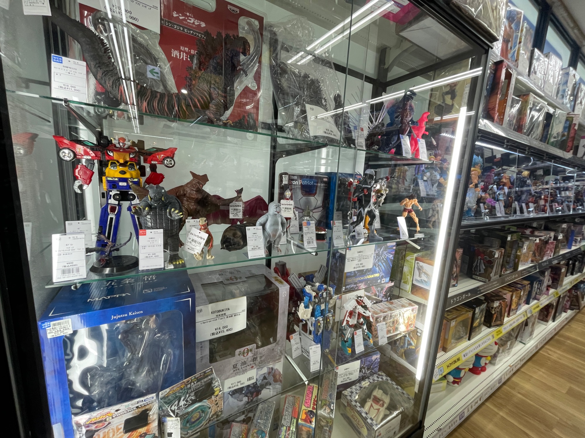 続いては、フィギュア・レトロホビーコーナーのご紹介です。大型のソフビや懐かしのロボット玩具、フィギュア類などを展示しております。その他のホビー売場と比べると並んでいる商品のジャンルが様々であることが最大の特徴となっており、意外なアイテムに出会えることも…。