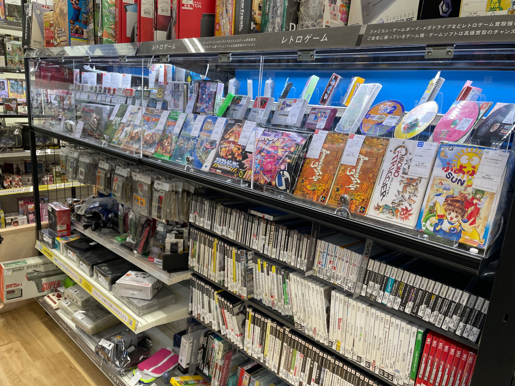 お次は、ゲームコーナーです。Switch等の最新作は勿論、レトロゲームも多数お取り扱いしております。ゲームソフトだけでなく、ゲーム機本体も売場に展開中です。