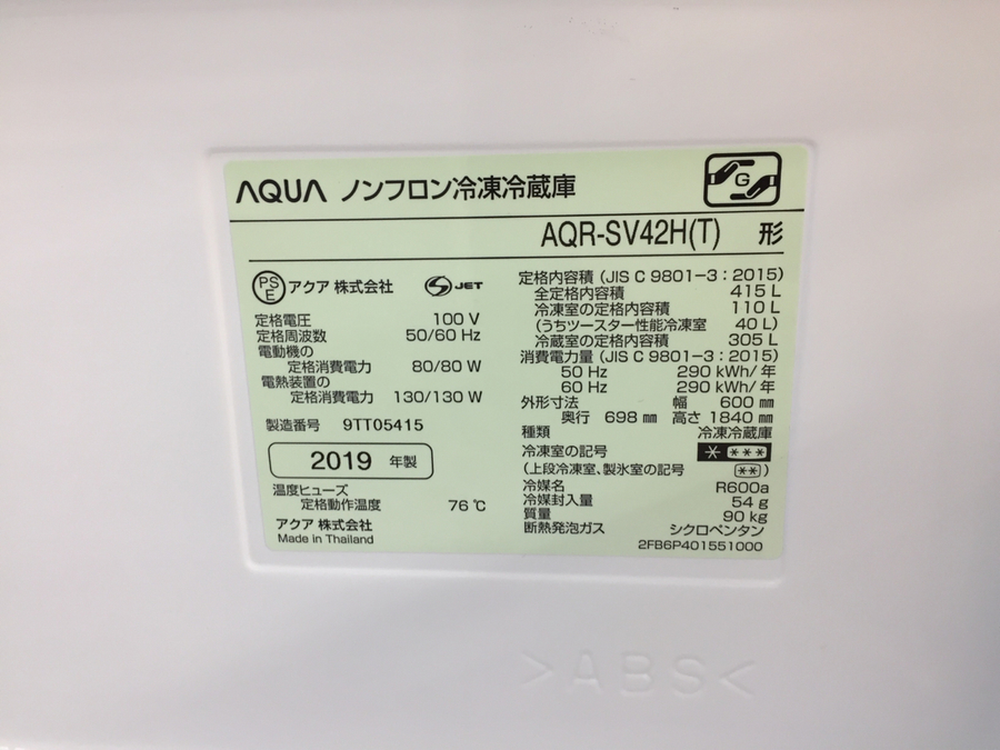 【AQUA(アクア) 5ドア冷蔵庫 AQR-AV42H 2019年製】