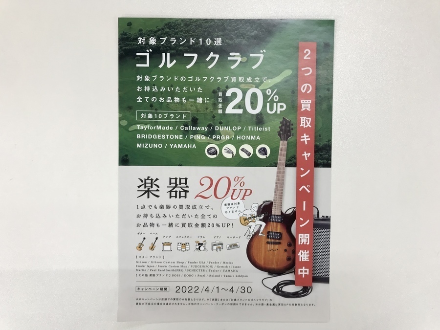 【4月はゴルフクラブ・楽器が熱い!!!】●お買取りキャンペーン中!!ゴルフクラブ対象ブランド10選、楽器の買取がなんと20%UP!!