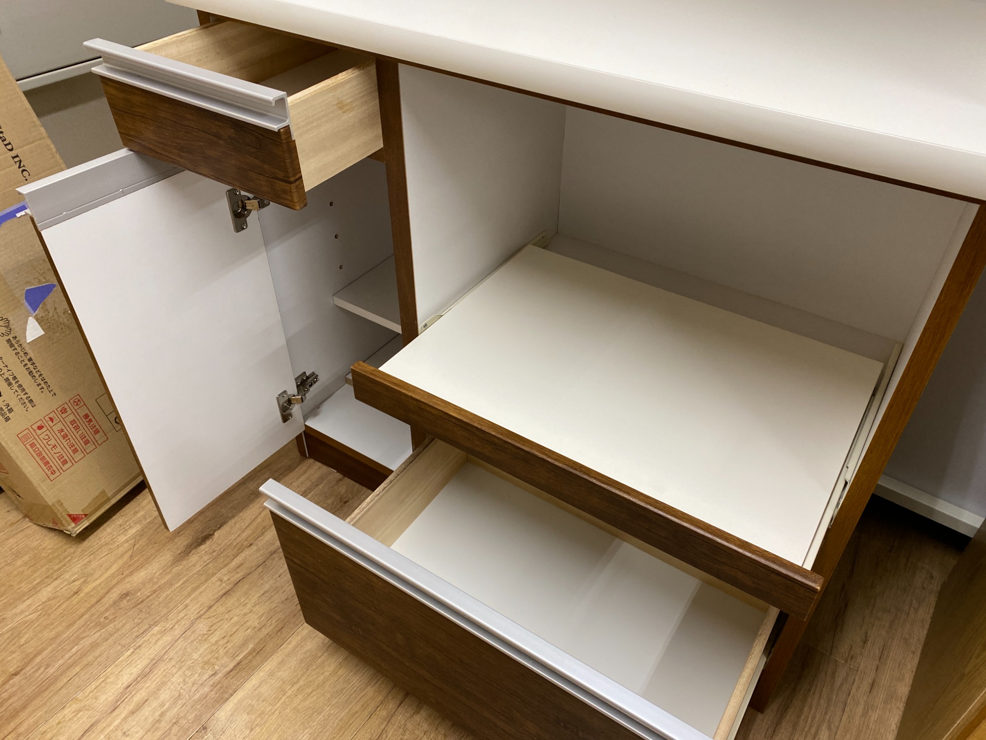 色はブラウンとホワイトカラーが基調のデザインでお部屋の雰囲気に合い易く、収納力抜群のキッチン家具となっております!!
