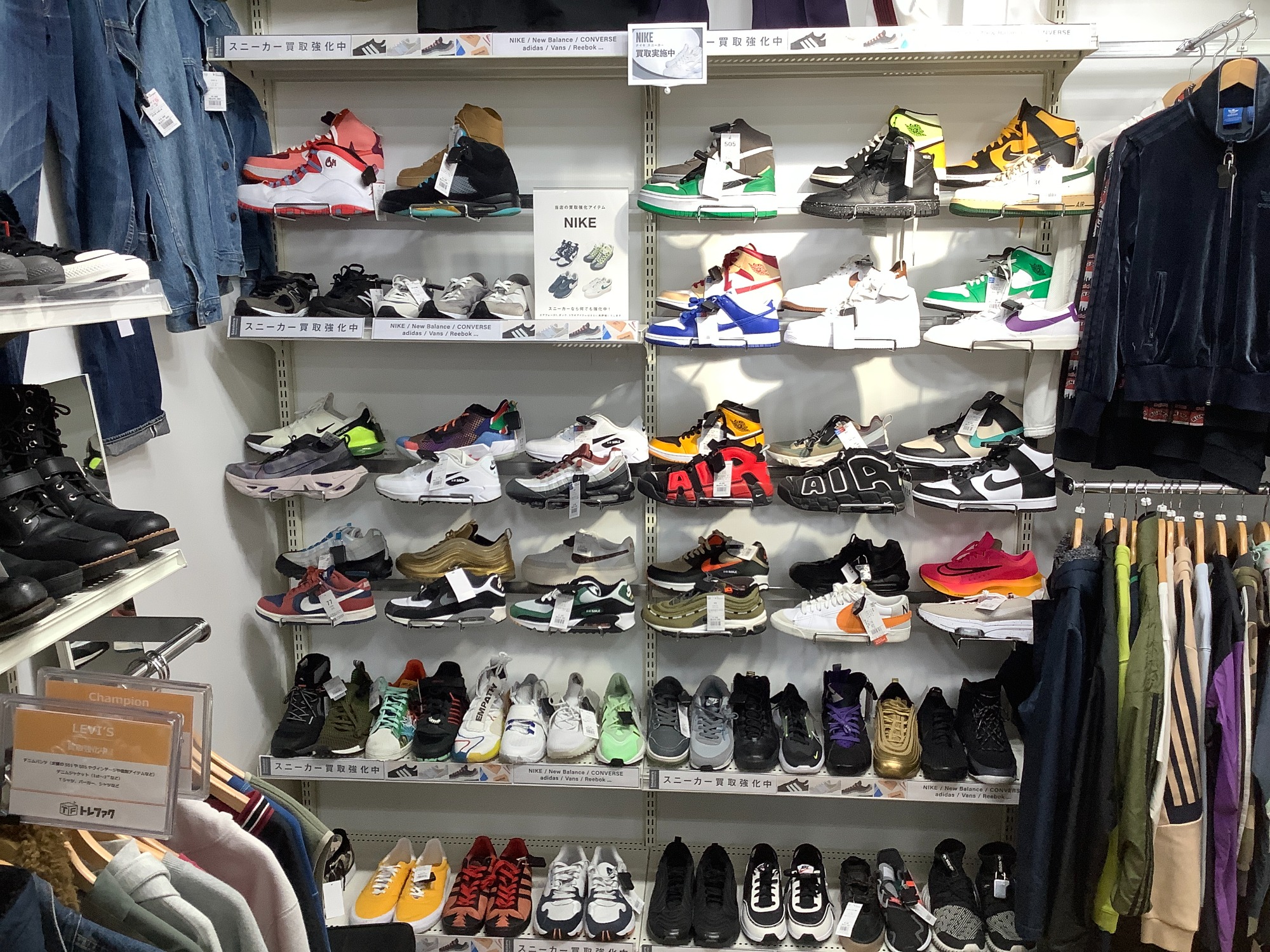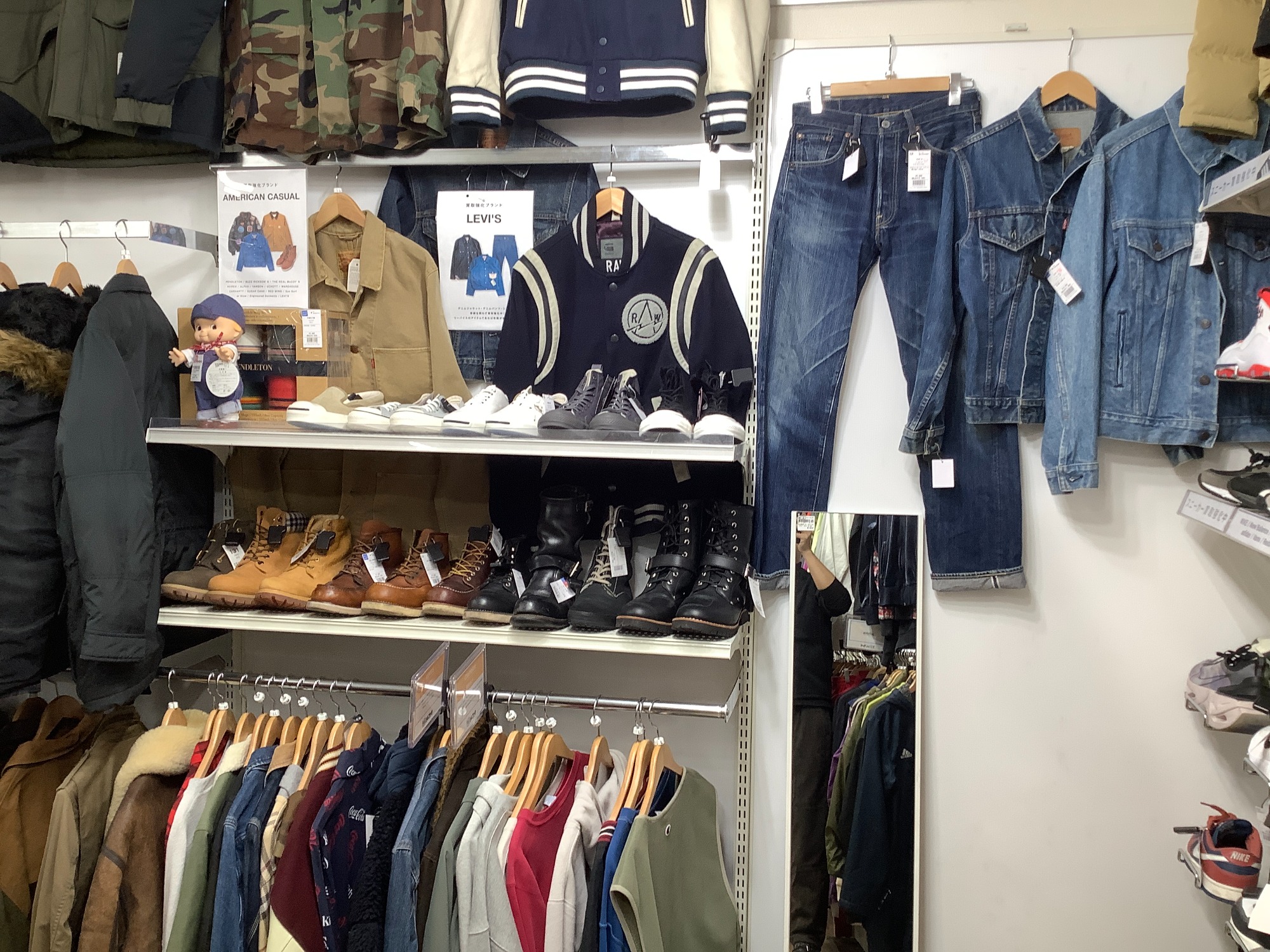 アメカジコーナーでは定番のリーバイスやチャンピオン、レッドウィングなど渋カジ時代を経験した