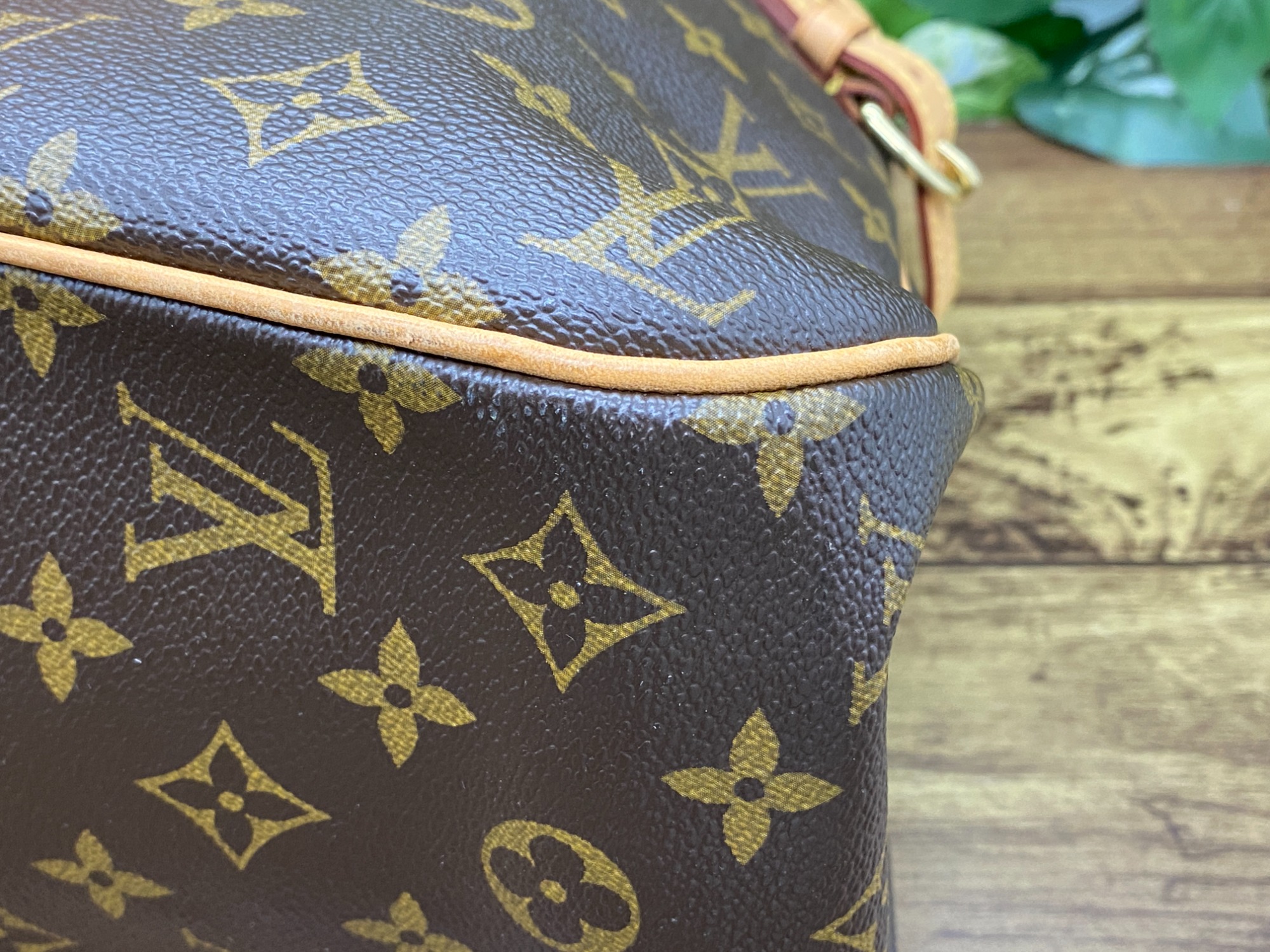 こちらのバッグは皮革部分に割れと角スレがございますが、目立つ程のキズではございません。