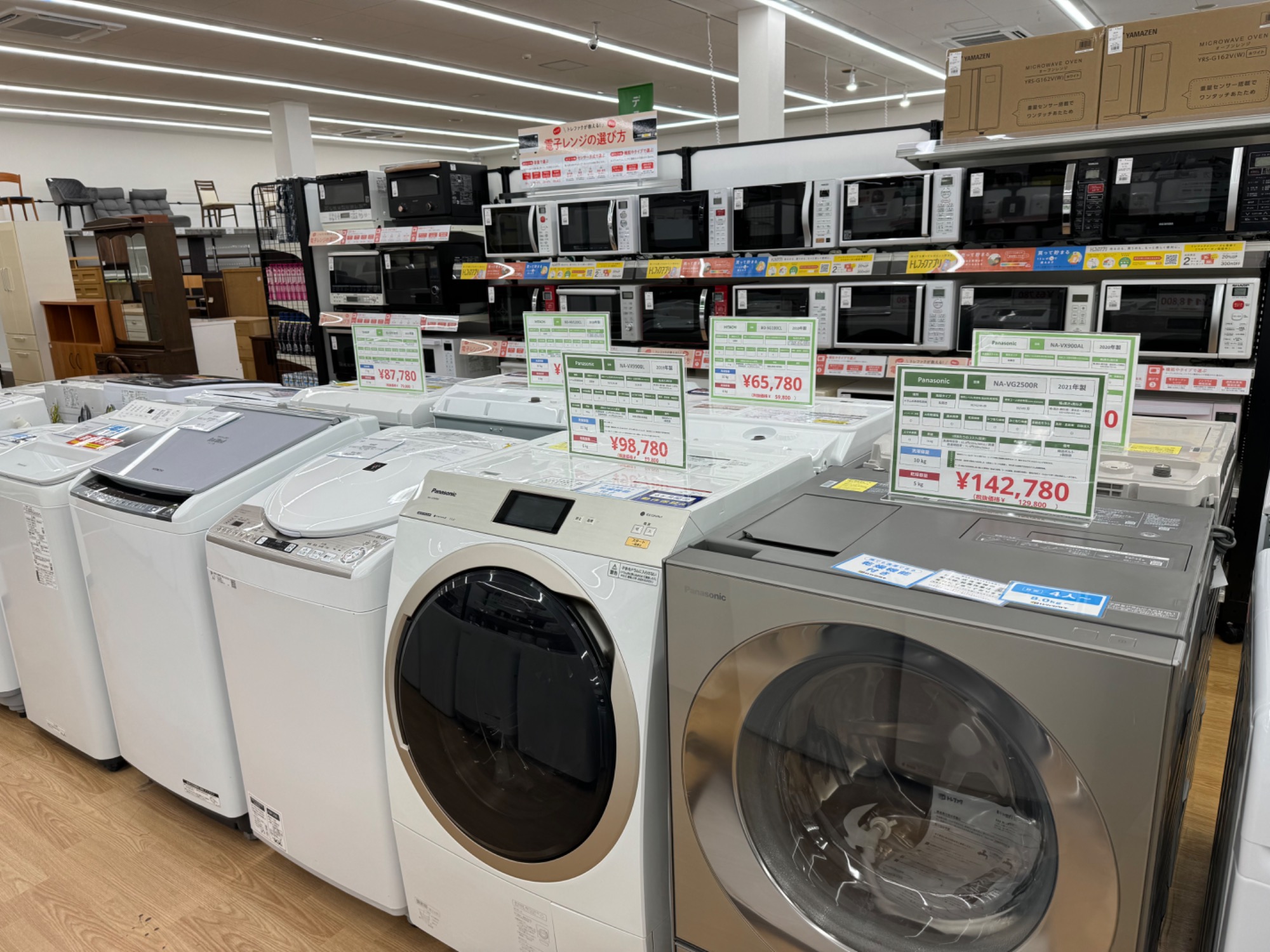大型冷蔵庫やドラム式洗濯機の展示台数が半端ないです。