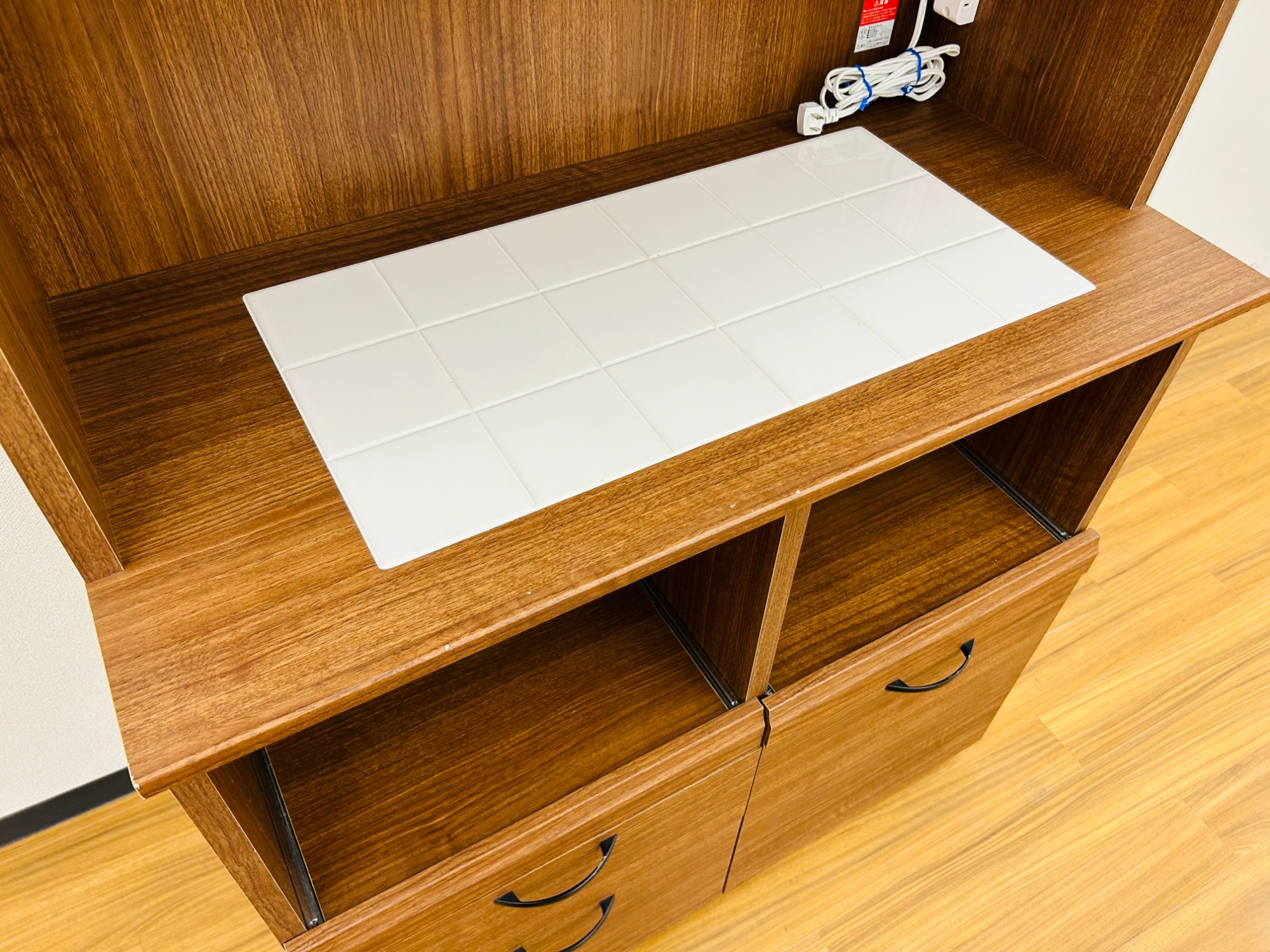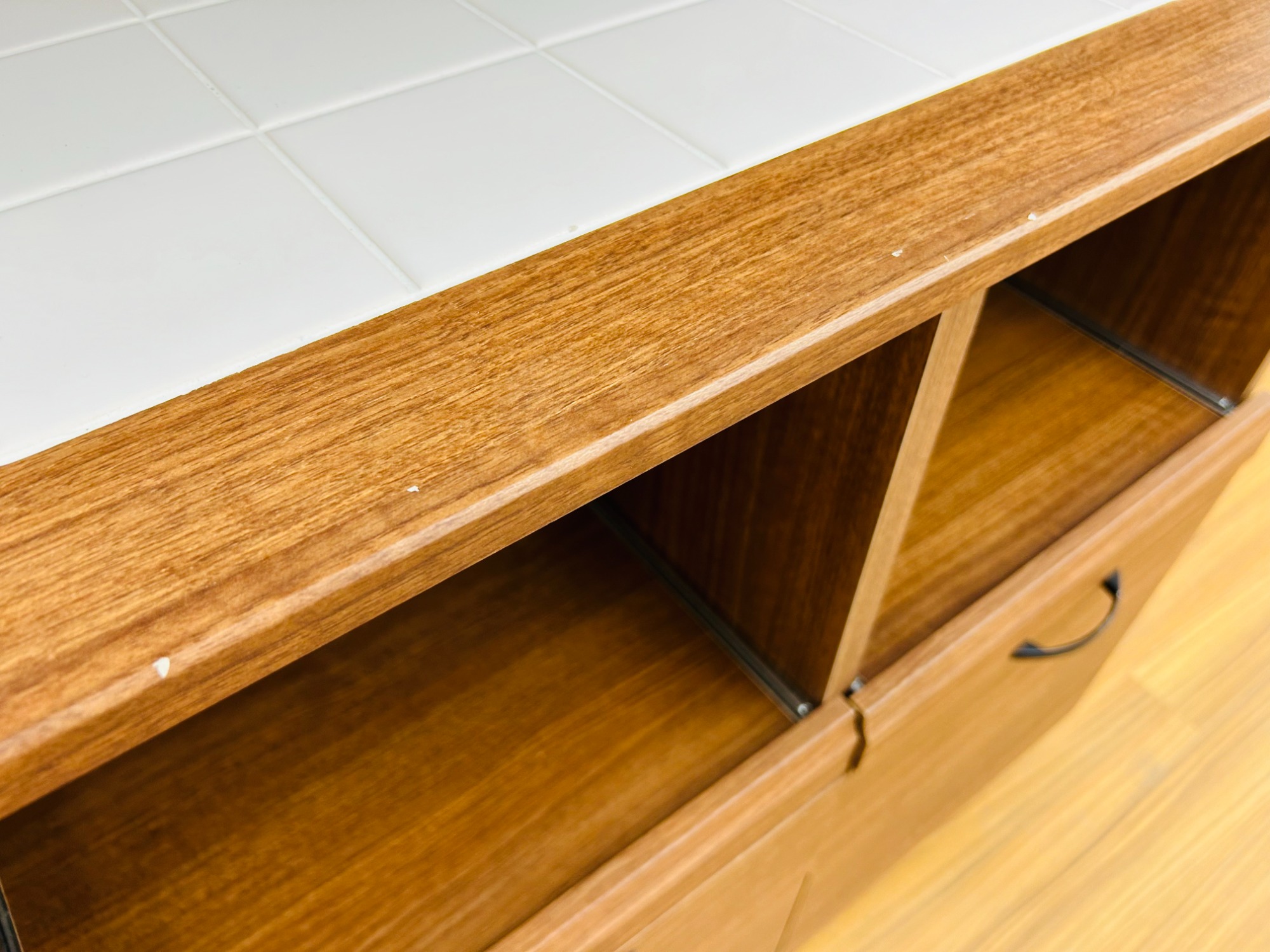 真ん中のタイル天板とチェッカーガラスがアクセントになっているかわいらしいデザイン。