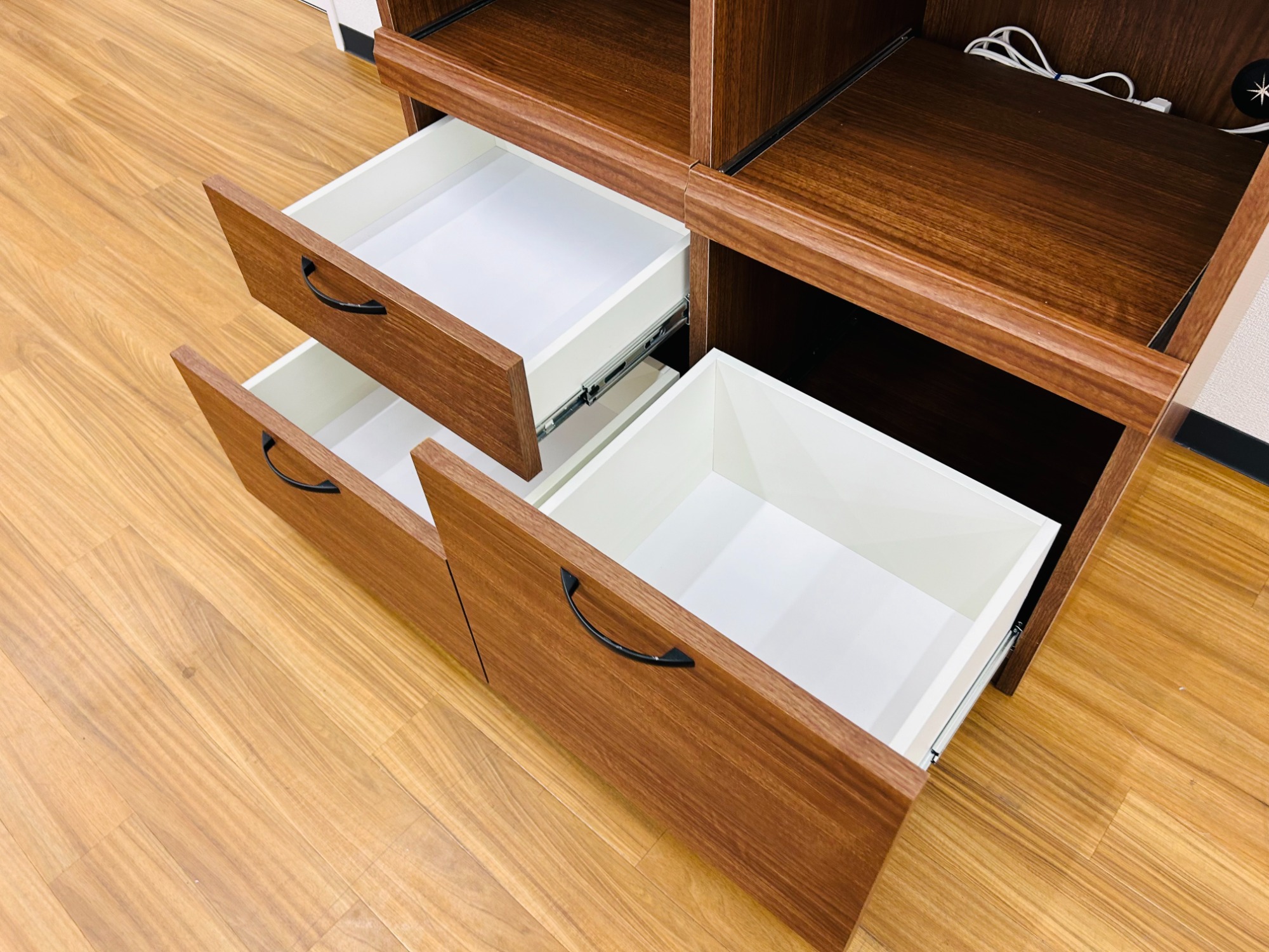 電子レンジや炊飯器を設置でき、引き出しも充実しており見た目だけでなく機能面でも優れた一品です。