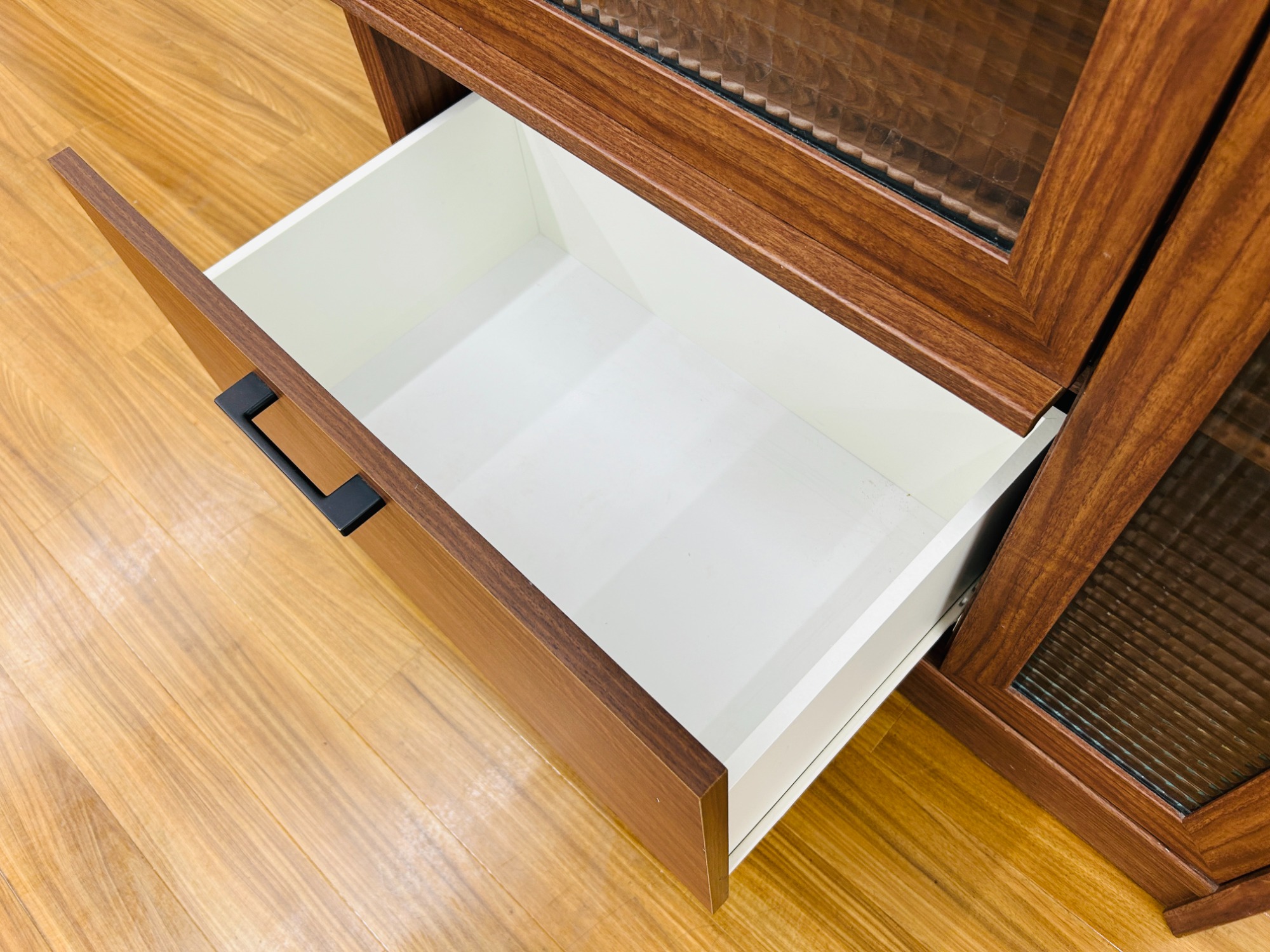 フラップ式の扉は開け閉めが簡単で使いやすく、モザイクのガラスは目隠しの役割もこなす優等生。