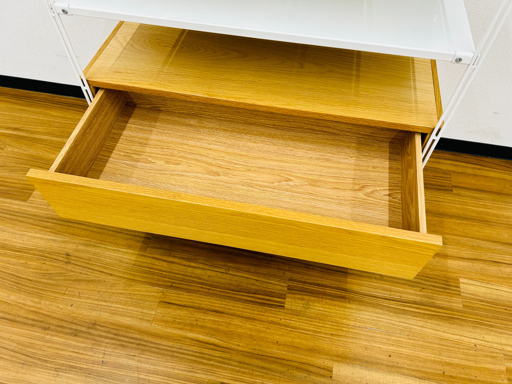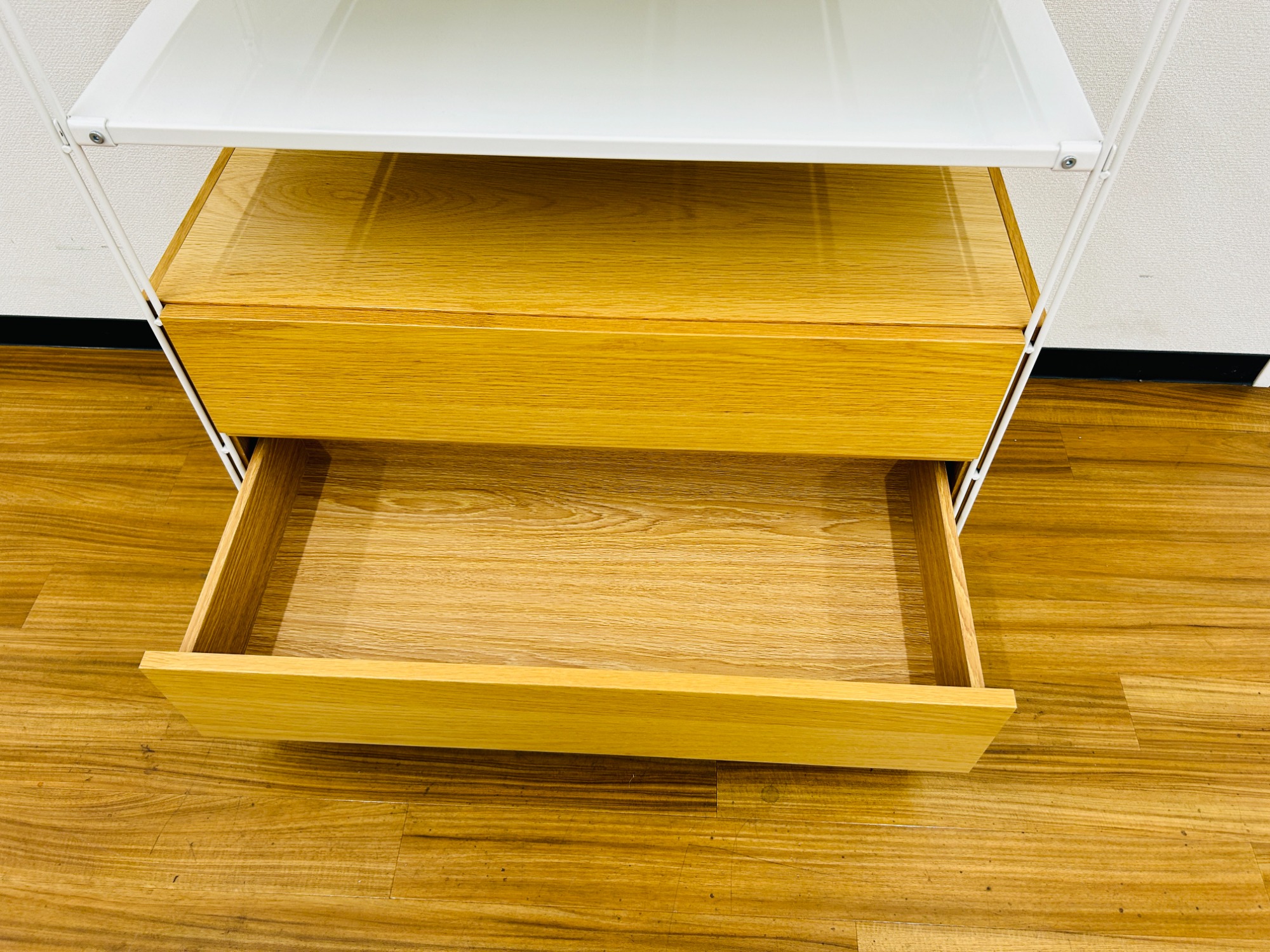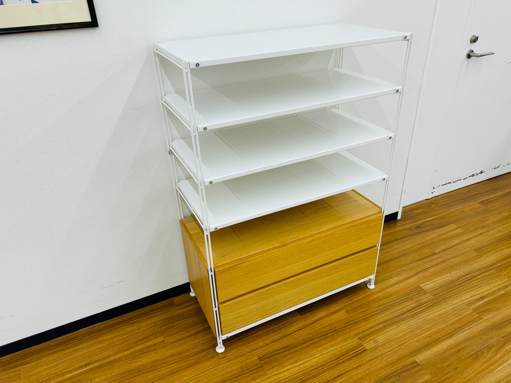 下段が2段の引き出しになっており書類などの収納に適しています。上段部分はフリーラックとなっているので様々な用途で使用ができます。