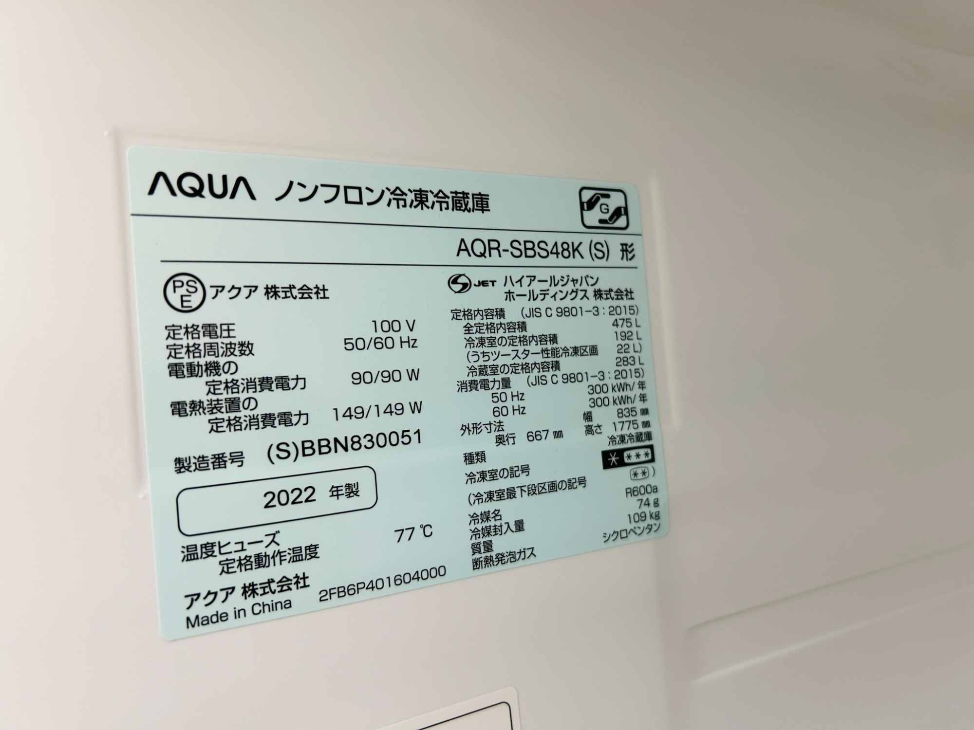 容量:475L(冷蔵283L/冷凍192L)