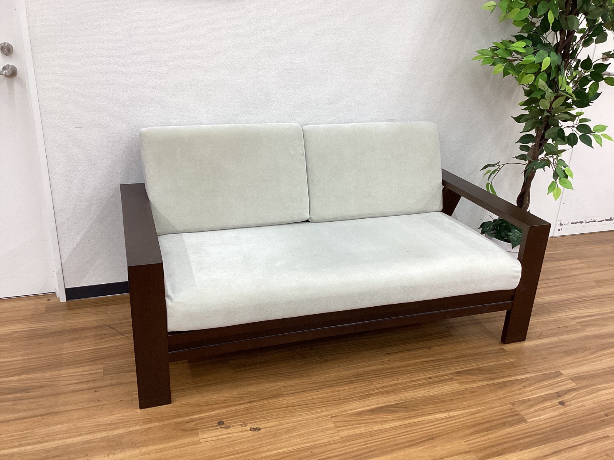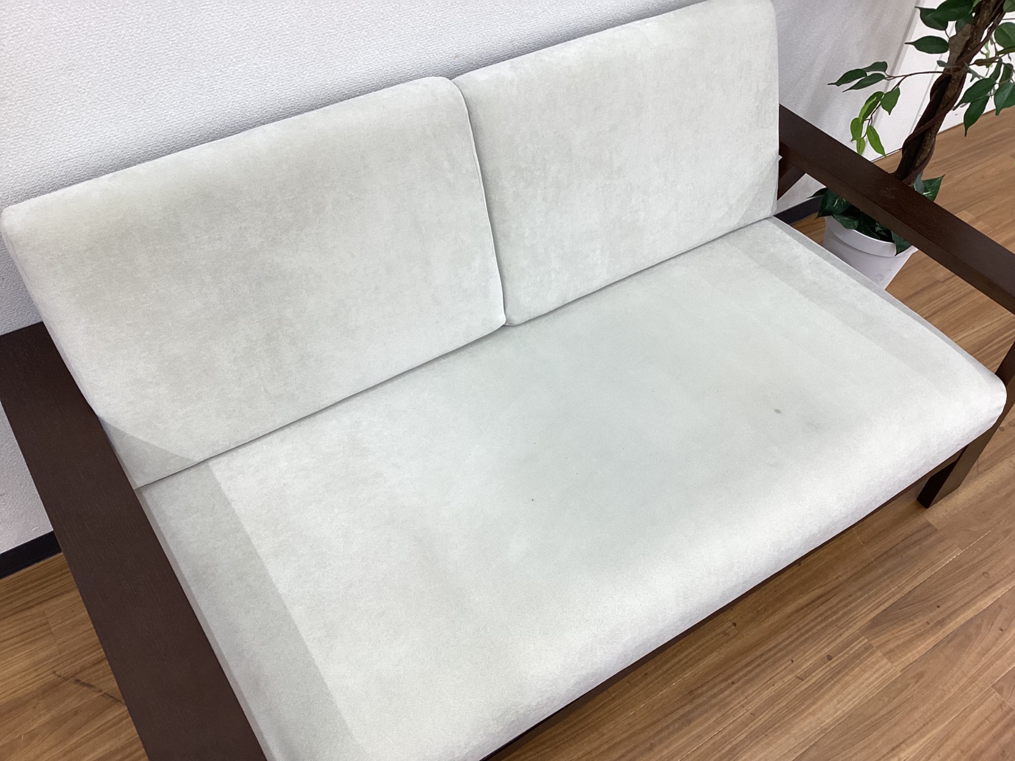 ホワイトカラーの背もたれ・座面が特徴的な2人掛けソファーです。