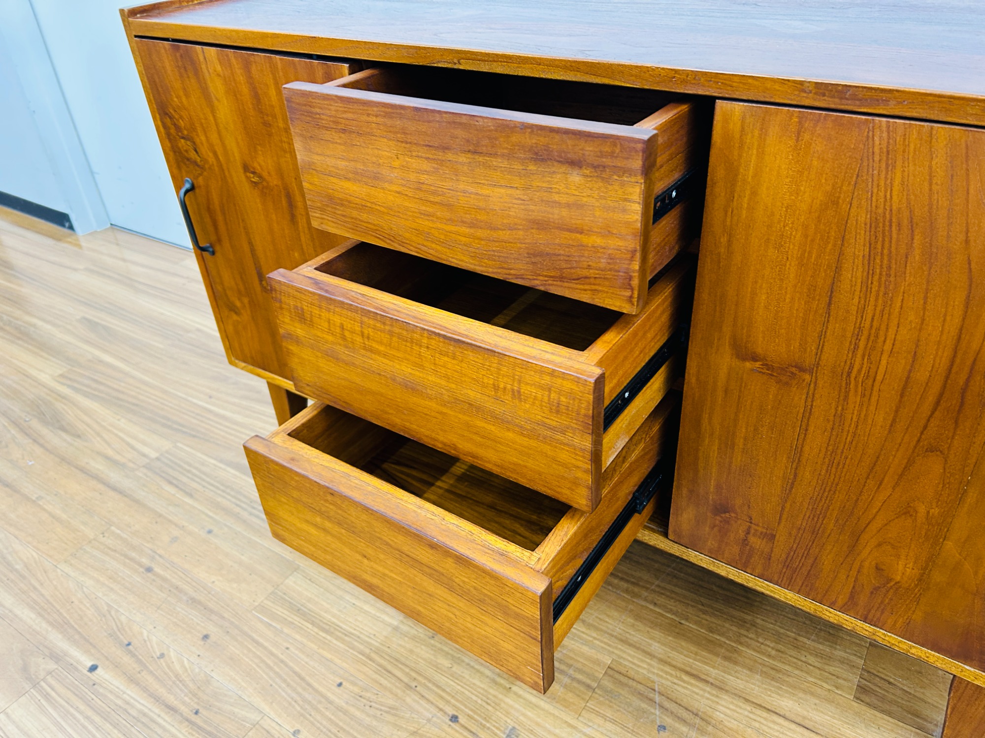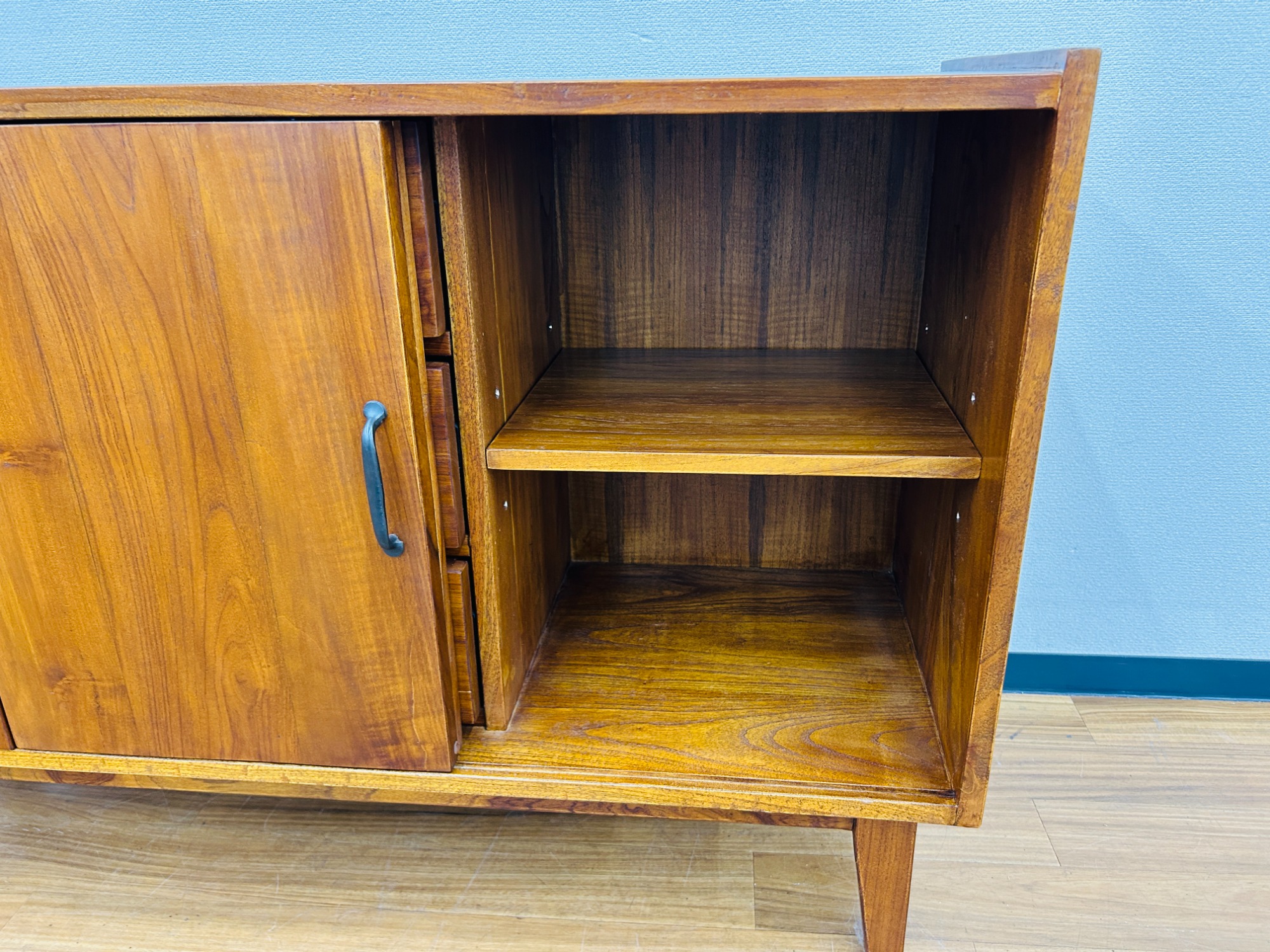 左右のスライド戸にはそれぞれ高さを変えられる収納と真ん中には3段の引き出しが付いており使いやすいサイドボードです。見た目良し、機能良しの一品です。一点限りのお品物となりますのでご興味を持たれた方はお気軽に当店までお越しください。