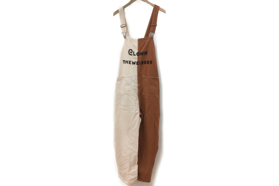 バイカラーと英字が特徴的なオーバーオールです。