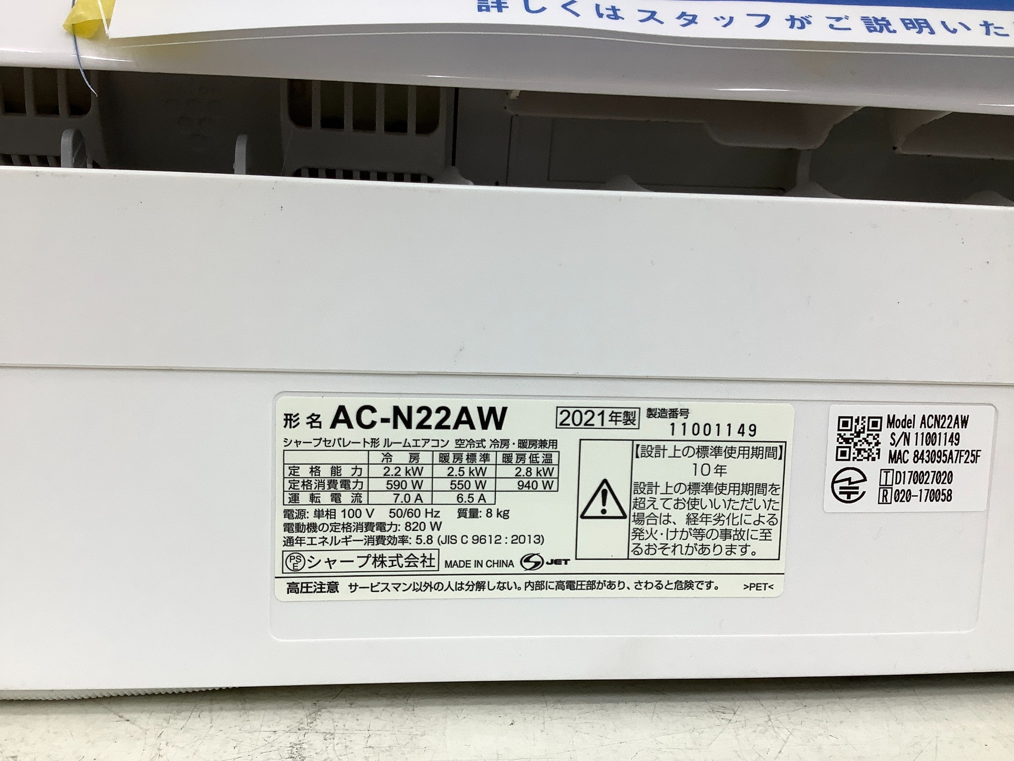 【SHARP 壁掛けエアコン AC-N22AW 】