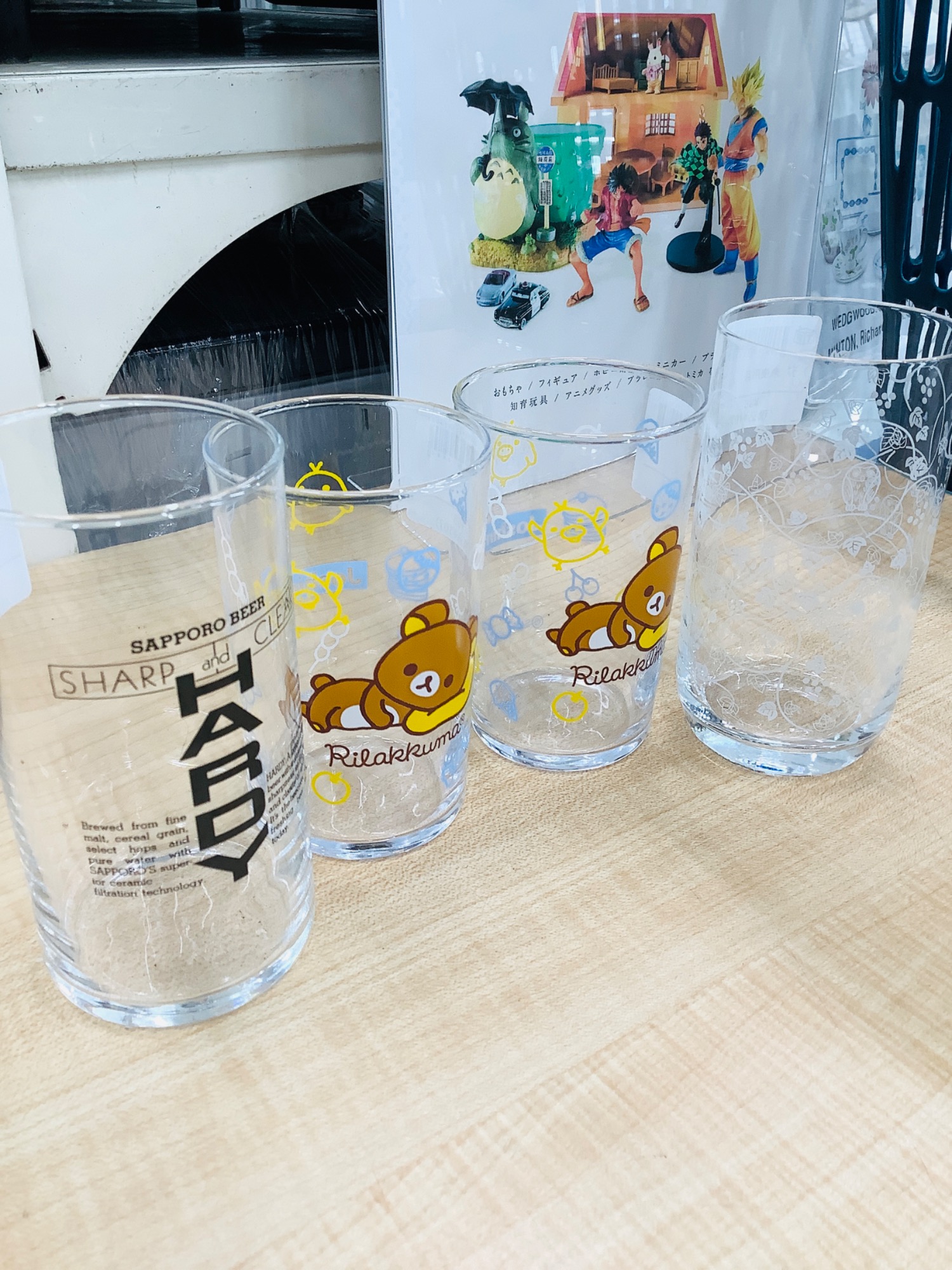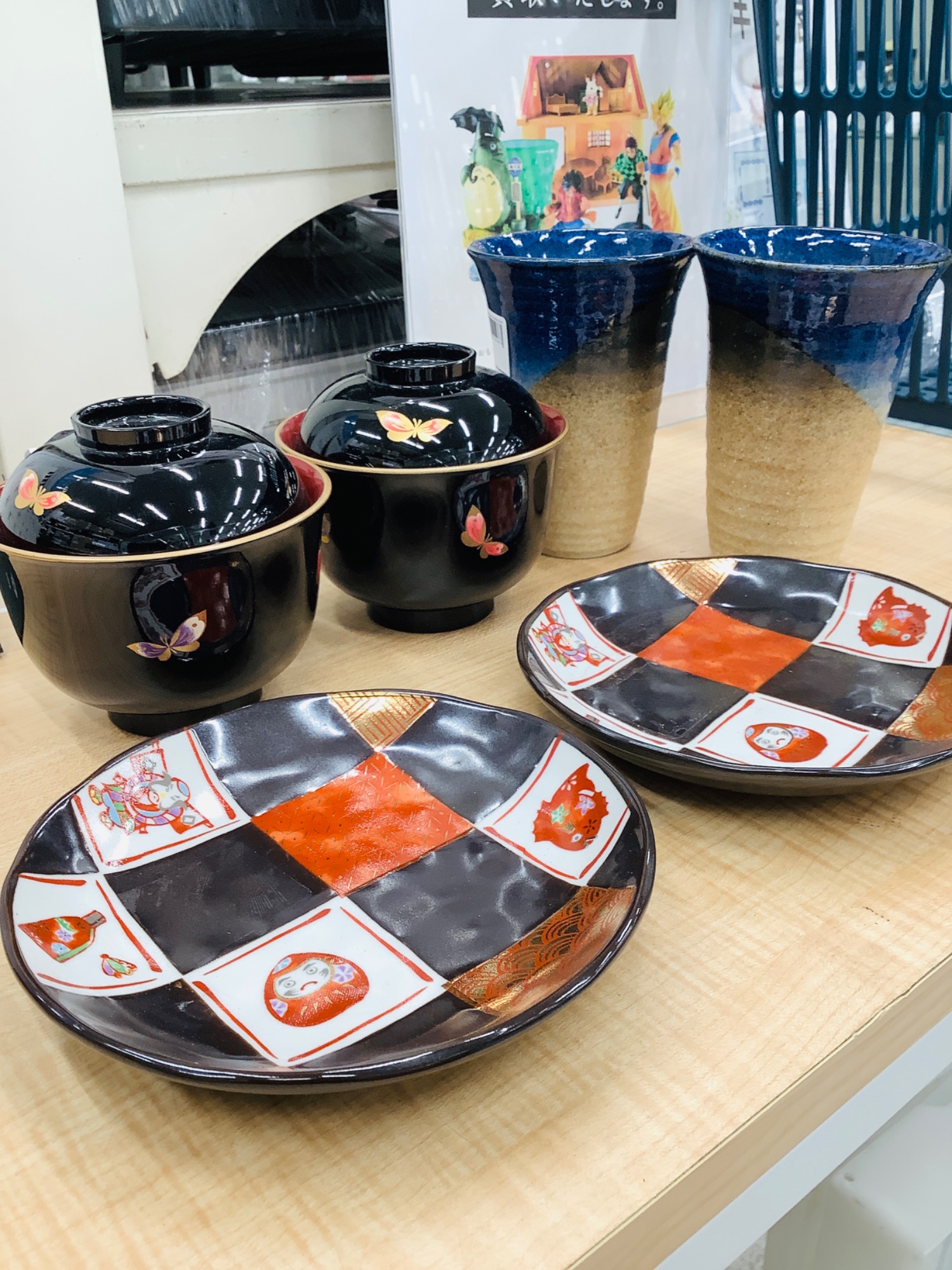 キャラクター入りグラスも焼き物も漆器までも全て98円(+税)です
